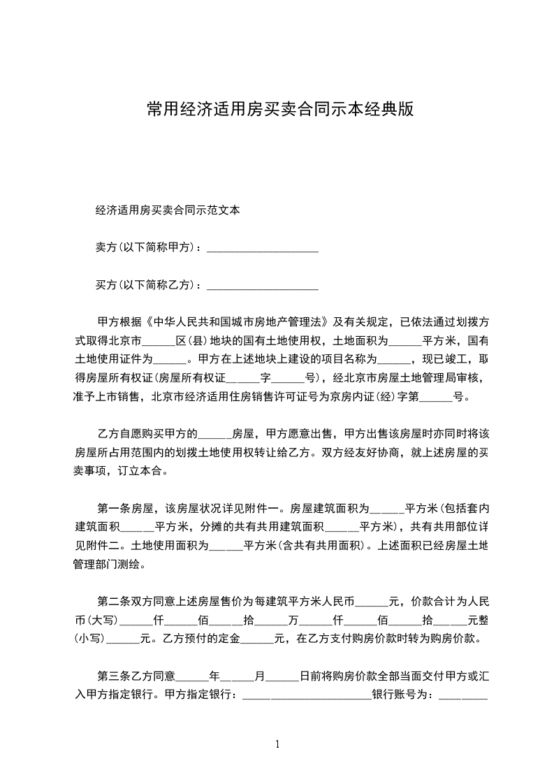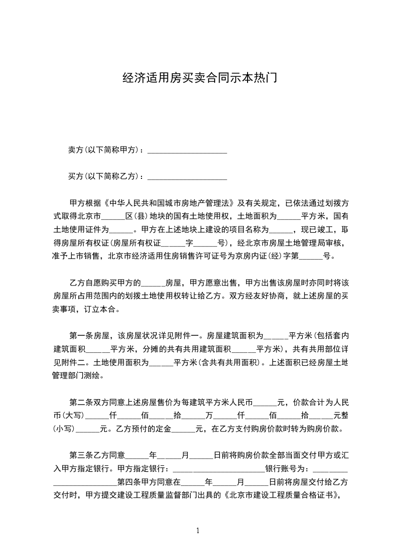 甲方根据《中华人民共和国城市房地产管理法》及有关规定,已依法通过划拨方式取得北京市______区(县)地块的国有土地使用权,土地面积为______平方米,国有土地使用证件为______。甲方在上述地块上建设的项目名称为______,现已竣工,取得房屋所有权证(房屋所有权证______字______号),经北京市房屋土地管理局审核,准予上市销售,北京市经济适用住房销售许可证号为京房内证(经)字第______号。