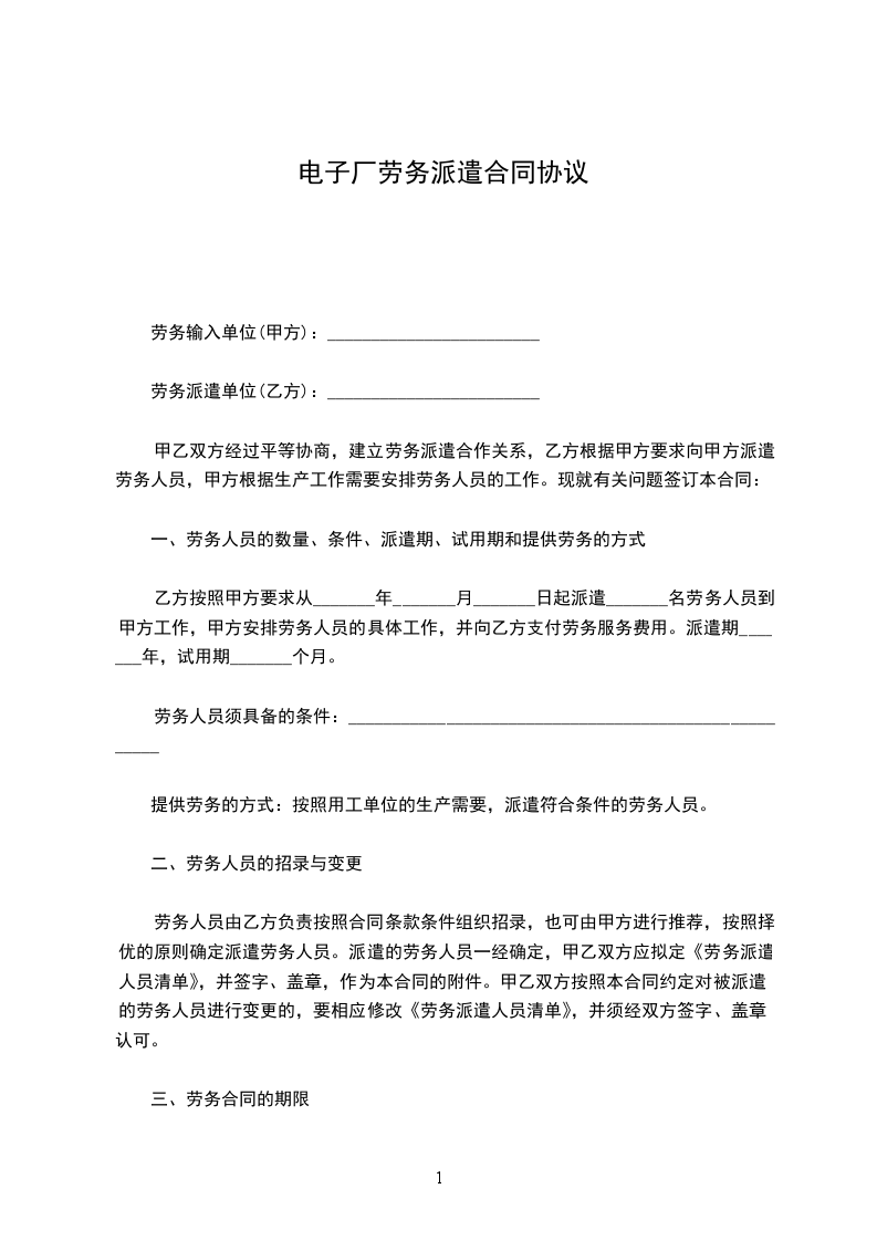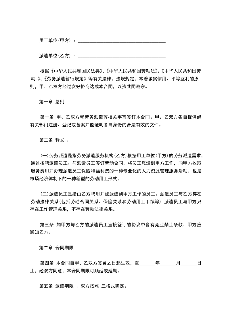 乙方按照甲方要求从_______年_______月_______日起派遣_______名劳务人员到甲方工作,甲方安排劳务人员的具体工作,并向乙方支付劳务服务费用。派遣期_______年,试用期_______个月。