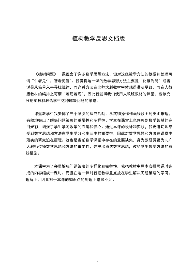 《植树问题》一课蕴含了许多数学思想方法,但对这些数学方法的挖掘和处理可谓“仁者见仁,智者见智”。我觉得这一课的数学思想方法主要是“化繁为简”或者说是从简单入手寻找规律,而这种方法在北师大版教材中体现得淋漓尽致,而在人教版教材的编排上可谓“若隐若现”,因此我觉得我们使用人教版教材的课堂,应该充分挖掘教材教给学生这种解决问题的策略。