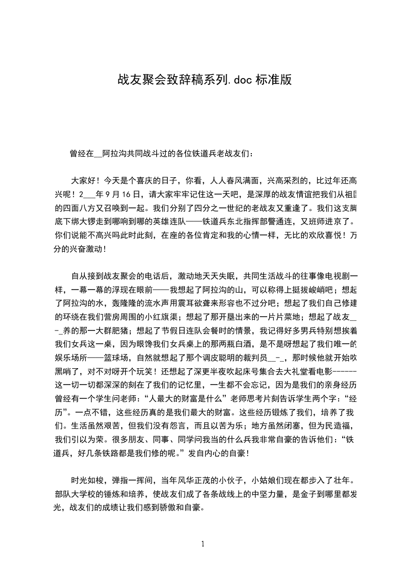 大家好!今天是个喜庆的日子,你看,人人春风满面,兴高采烈的,比过年还高兴呢!2___年9月16日,请大家牢牢记住这一天吧,是深厚的战友情谊把我们从祖国的四面八方又召唤到一起。我们分别了四分之一世纪的老战友又重逢了。我们这支脚底下绑大锣走到哪响到哪的英雄连队——铁道兵东北指挥部警通连,又班师进京了。你们说能不高兴吗此时此刻,在座的各位肯定和我的心情一样,无比的欢欣喜悦!万分的兴奋激动!