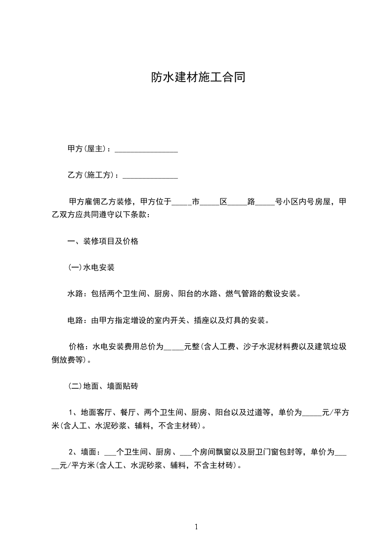 价格:水电安装费用总价为_____元整(含人工费、沙子水泥材料费以及建筑垃圾倒放费等)。