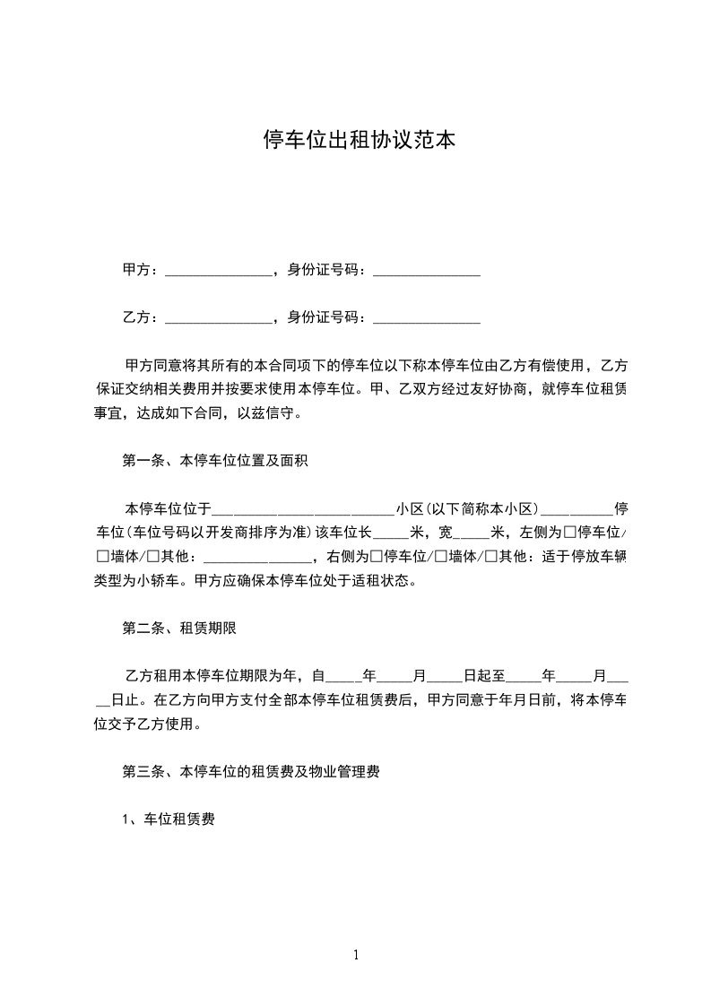 本停车位位于_________________________小区(以下简称本小区)__________停车位(车位号码以开发商排序为准)该车位长_____米,宽_____米,左侧为□停车位/□墙体/□其他:_______________,右侧为□停车位/□墙体/□其他:适于停放车辆类型为小轿车。甲方应确保本停车位处于适租状态。