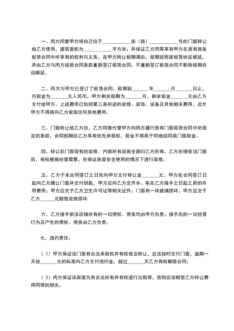一、丙方同意甲方将自己位于____________街(路)____________号的门面转让给乙方使用,建筑面积为____________平方米;并保证乙方同等享有甲方在原有房屋租赁合同中所享有的权利与义务,在甲方转让租期满后,租期按照原租赁协议顺延,并由乙方与丙方按原合同条款重新签订租赁合同。不重新签订租赁合同不影响租期自动顺延。