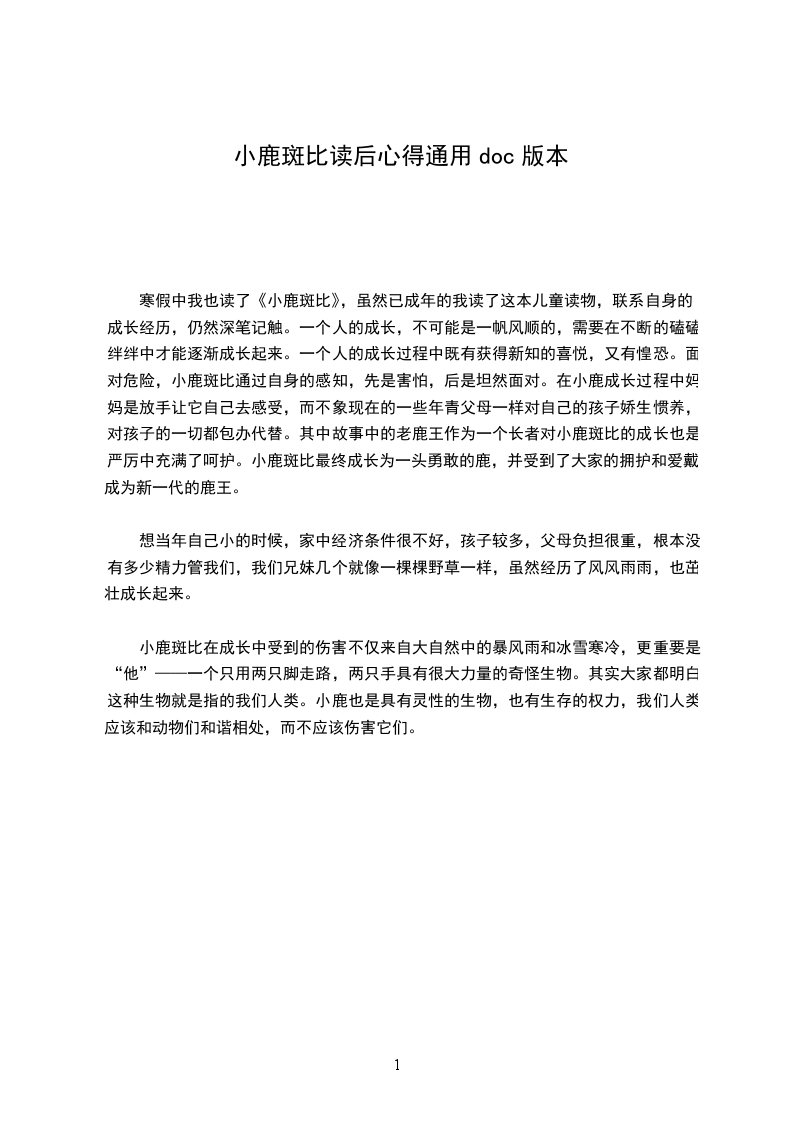 读完《小鹿斑比》这本书,我被深深的打动了——这是一个关于成长的故事。《小鹿斑比》讲述了一只叫斑比的小鹿从出生到成为鹿王的成长经历。作者用拟人的手法塑造了一个个生动鲜活的动物形象,它们有性格,会思考,生活中充满喜怒哀乐。在这些小动物中,斑比给我留下的印象最深刻。童年时代的斑比活泼可爱,对所有事物都充满了好奇;青年时代的斑比谦和有礼、善于思考;成年后的斑比沉稳内敛、坚强勇敢,不断探寻着生活的真谛,虽然随着时间的推移,斑比的性格不断发生着变化,但我总是能够从斑比一言一行中看到善良和爱的光环,感受到坚定的信念和无畏的勇气。从斑比的身上,我仿佛看到了自己的影子,而斑比成长中的困惑、苦涩、迷茫、伤痛,也就是我将要面对经历的。生活道路上,不会总是一帆风顺、艳阳高照,常常会有荆棘坎坷、风霜雨雪阻碍前行,我会以斑比为榜样,一步一个脚印走过成长的每一段路,在成长中学会爱、学会坚强,勇敢的去面对来自生活的种种挑战。评价:小作者从《小鹿斑比》的成长经历中,认识了许多有性格,会思考,充满喜怒哀乐的动物形象,特别是小鹿斑比,从一个活泼可爱的童年,到善于思考的青年,到坚强勇敢的成年,成长中有困惑、苦涩,迷茫,说明成长中要学会爱、学会坚强,勇敢面对生活挑战。