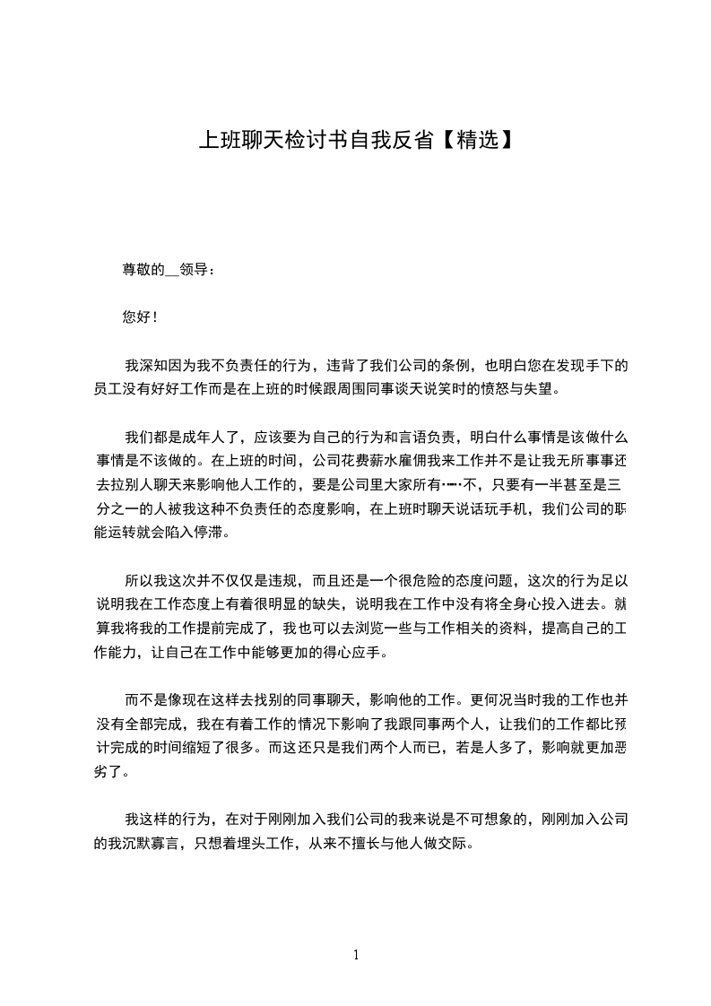 2___年3月22日,在我上班期间,我没有认真工作,却在仓库和同事聊天,并被店长发现。今天,我认真反思,深刻自剖,为自己的行为感到了深深地愧疚和不安,在此,我谨向各位领导做出深刻检讨,并将我几天来的思想反思结果向领导汇报如下:通过这件事,我感到这虽然是一件偶然发生的事情,但同时也是长期以来对自己放松要求,工作作风涣散的必然结果。经过几天的反思,我对自己这些年的工作成长经历进行了详细回忆和分析。