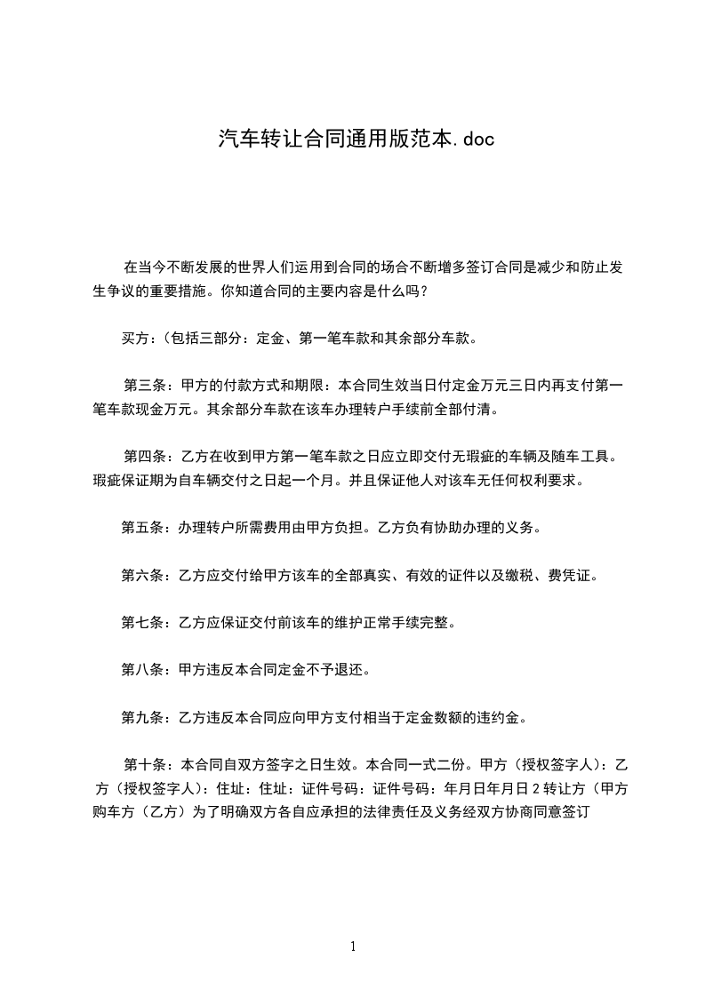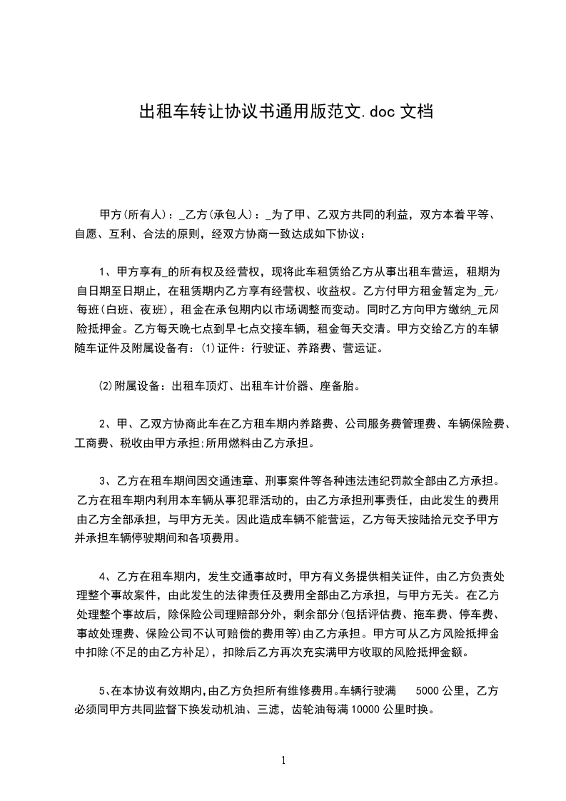 甲方和乙方在充分协商的情况下达成以下协议:甲方将本人拥有产权的一辆发动机号为:_________的全新_________版出租车一辆转让给乙方,现签订本协议,供双方遵照执行: