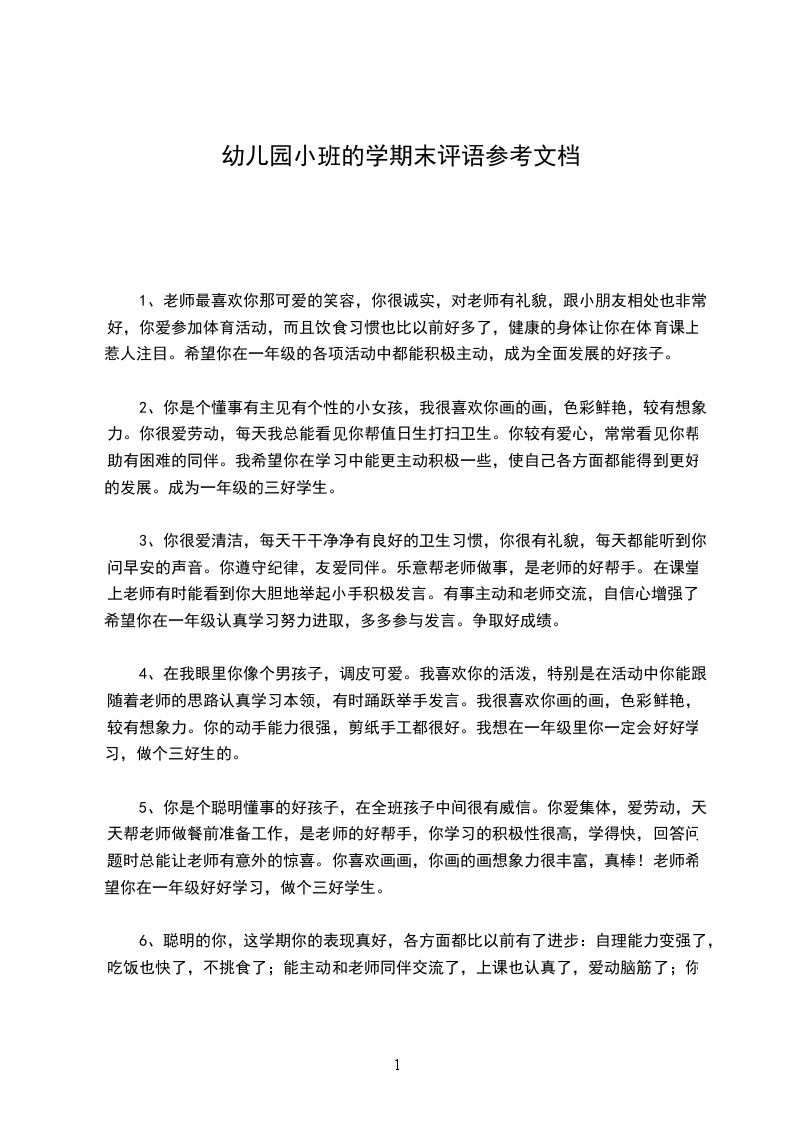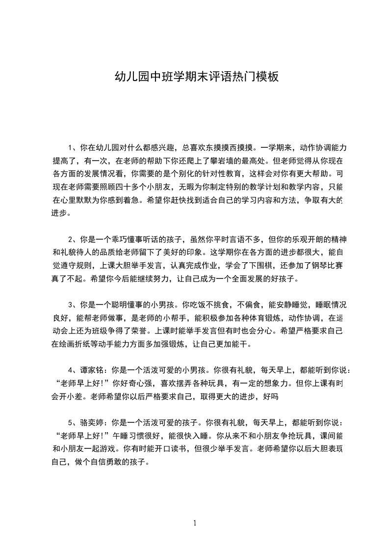 15、你是一个有礼貌聪明活泼热心的好孩子。这学期中我发现你长大了,懂事了,在各项活动中认真积极,和同学相处友爱团结。愿意帮助老师,同伴,这学期画画水平有了很大的进步。如果你在唱歌活动中能大胆的表现自己,那就更好了。