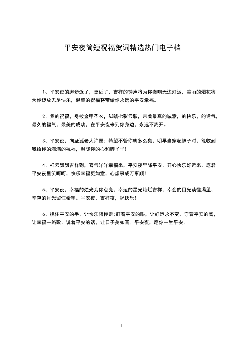 1、平安夜的脚步近了,更近了,吉祥的钟声将为你奏响无边好运,美丽的烟花将为你绽放无尽快乐,温馨的祝福将带给你永远的平安幸福。