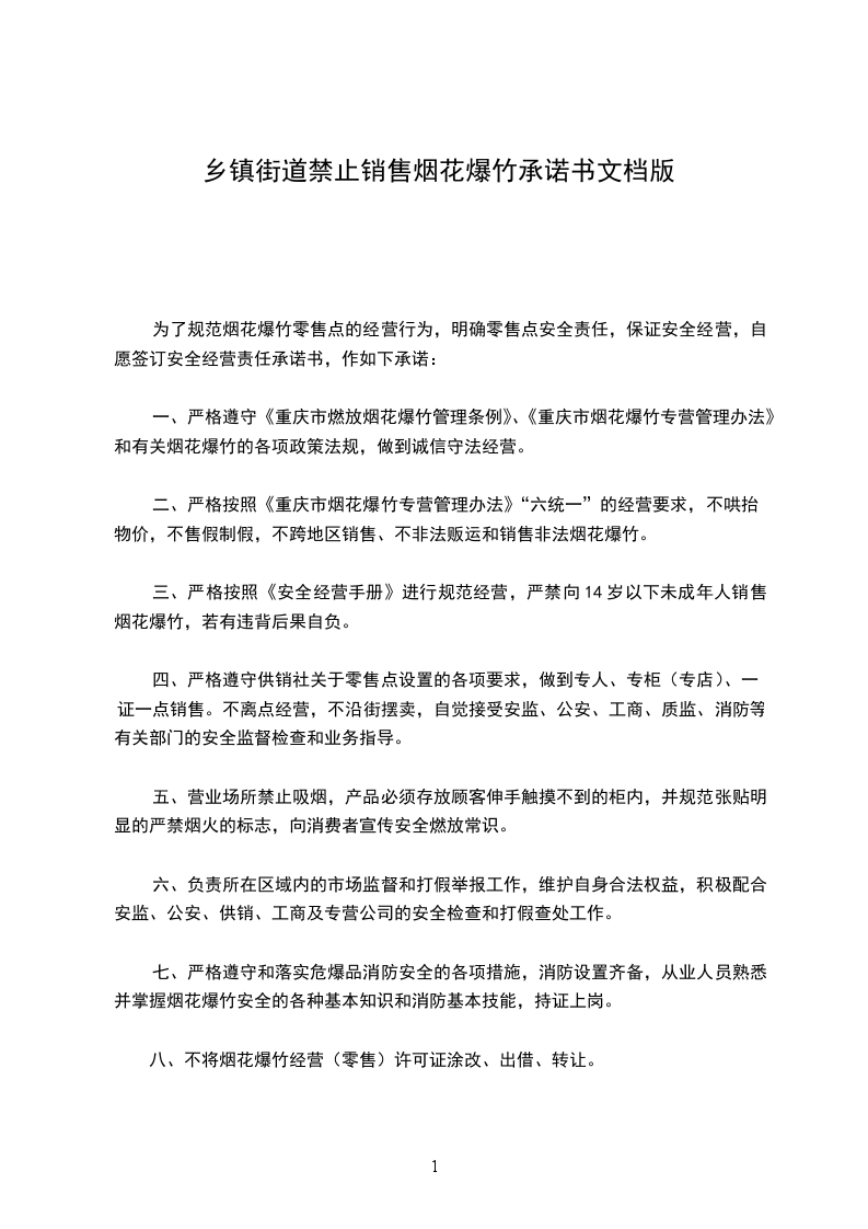 为了规范烟花爆竹零售点的经营行为,明确零售点安全责任,保证安全经营,自愿签订安全经营责任承诺书,作如下承诺: