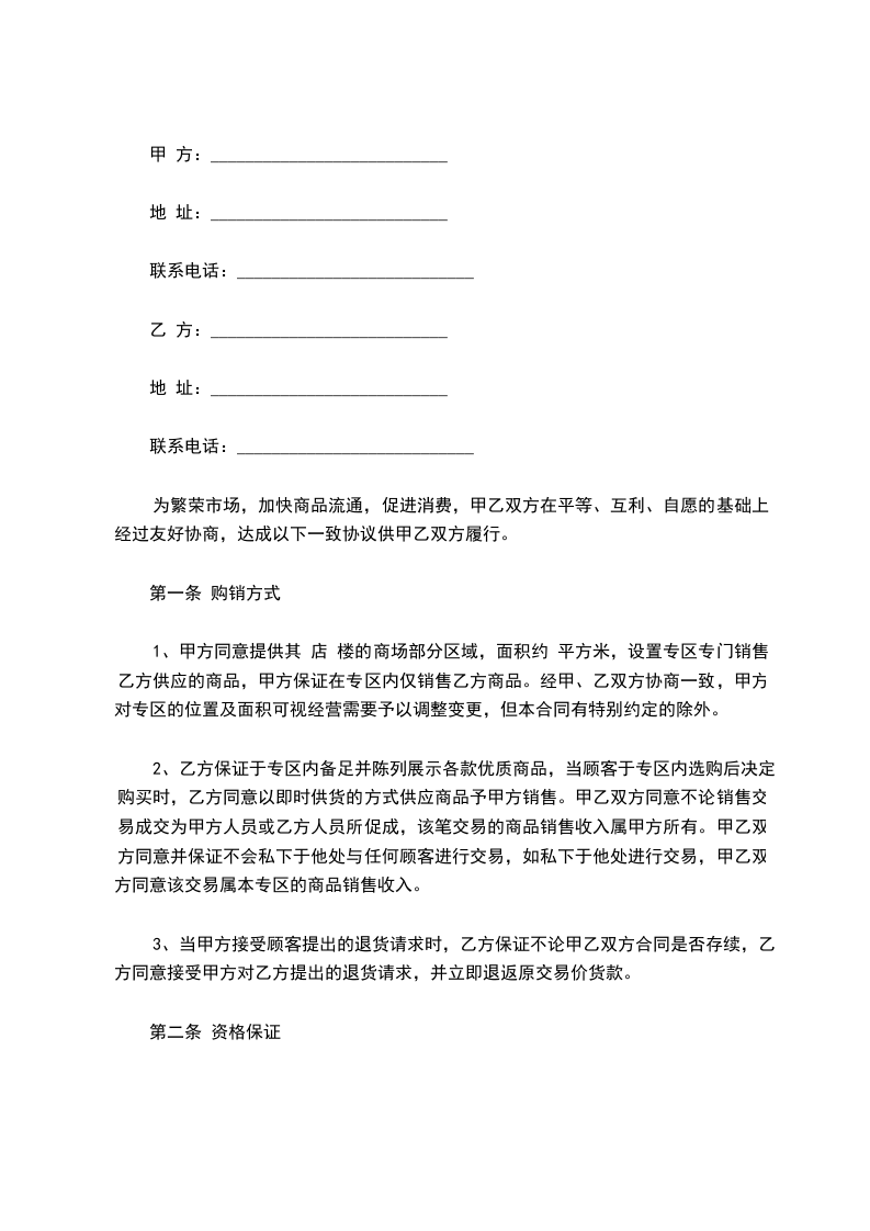 1、甲方同意提供其 店 楼的商场部分区域,面积约 平方米,设置专区专门销售乙方供应的商品,甲方保证在专区内仅销售乙方商品。经甲、乙双方协商一致,甲方对专区的位置及面积可视经营需要予以调整变更,但本合同有特别约定的除外。