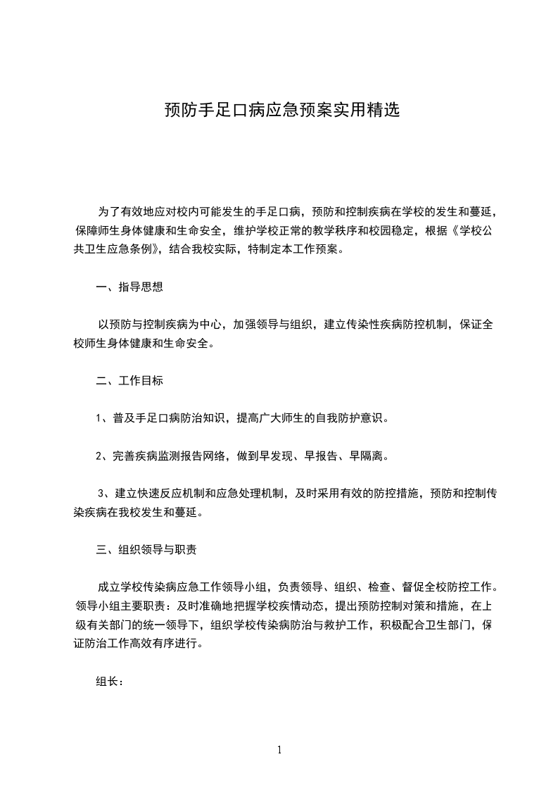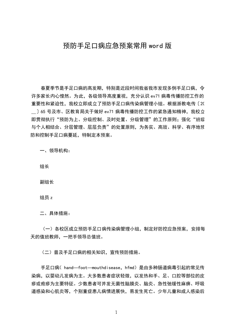 春夏季节是手足口病的高发期,特别是近段时间我省我市发现多例手足口病,令许多家长内心惶然。为此,各级领导高度重视,充分认识ev71病毒传播防控工作的重要性和紧迫性,我校立即成立了预防手足口病传染病管理小组。根据浙教电传〔20__〕65号及市、区教育局关于做好ev71病毒传播防控工作的紧急通知精神,我校立即贯彻执行“预防为上、分级控制、及时处置、分级管理”的工作原则;强化“班级与个人相结合、分层管理、层层负责”的处置原则,为务实、高效、科学、有序地预防和控制手足口病蔓延,特制定本预案。