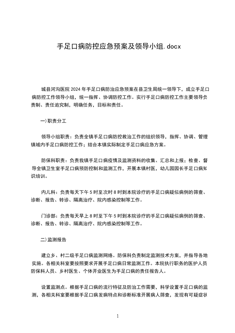 (一)各校区成立预防手足口病传染病管理小组,制定好防控应急预案,安排每天的值班教师,一把手领导总值班。