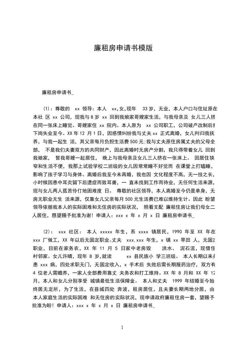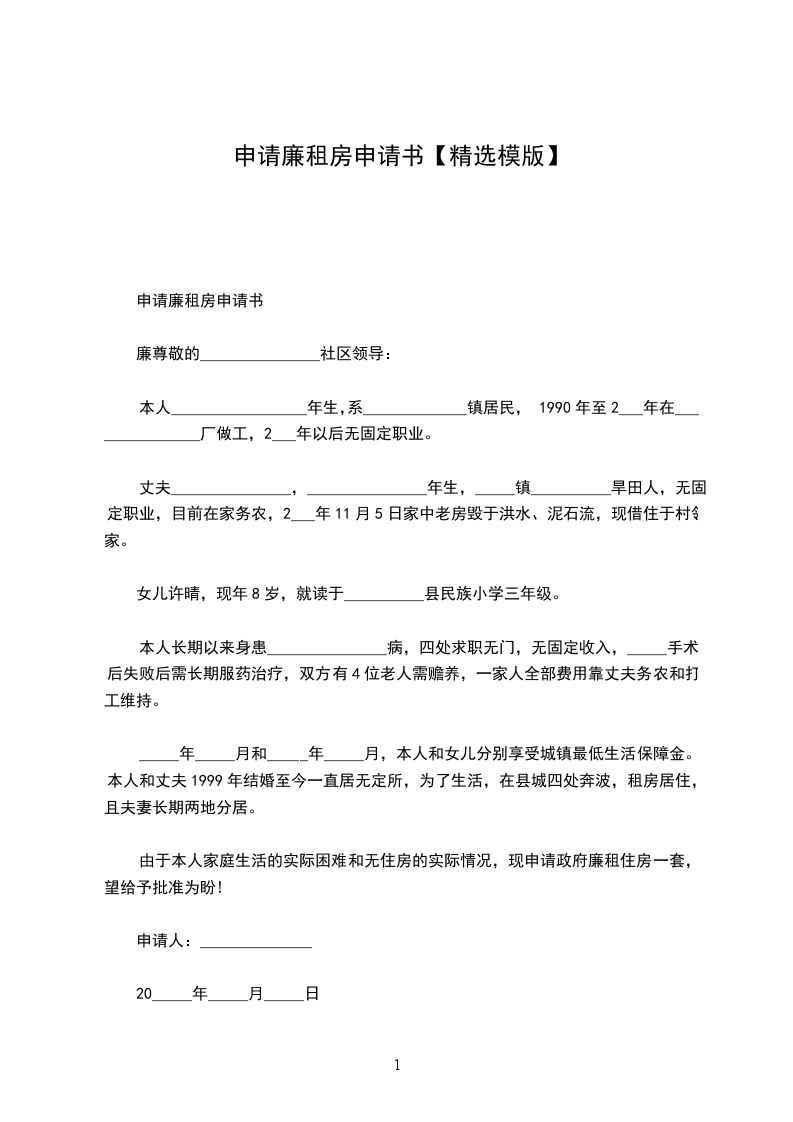 我叫___,原零陵区糖酒副食品公司职工,企业破产改制后“买断职工身份”,下岗在家待业。现属七层坡社区居民。因本人身患乙肝病、肝血管瘤,不能参加体力劳动,打工无人请,女儿七岁在校读书,爱人打工600-700元一个月。父亲身患结肠腺癌,母亲身患严重的心脏病,30多年,再新增病人部分脑梗死左下出血。父母身体很差,加之我身体差靠爱人打工维持家庭最低生活。父母住在原糖酒副食品公司宿舍,只有40个平方,一家人住在一起很难住下来。在经济十分困难的情况下,在外面租了一套住房,每月房租费150元。根据我的实际情况,请领导给予解决住房补助为感。