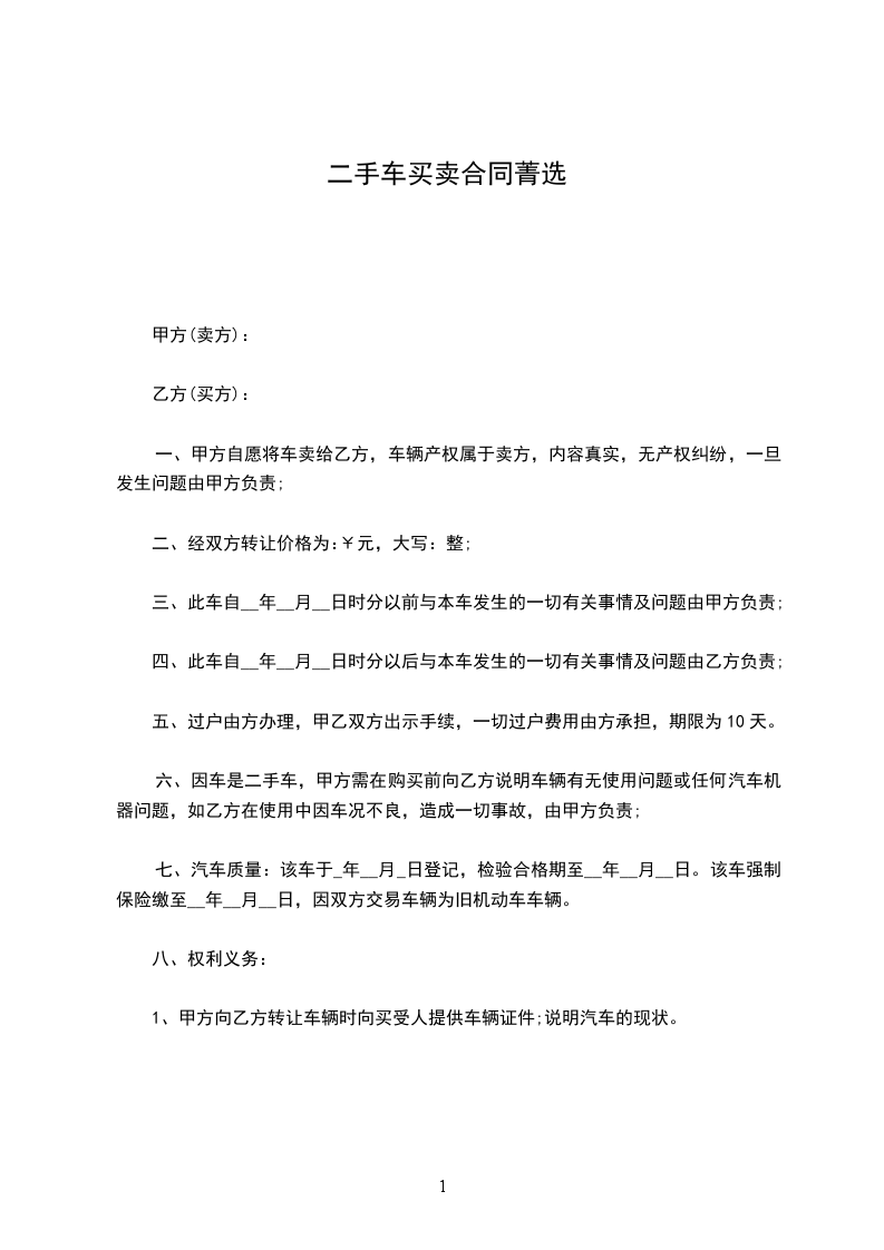 1.甲方应保证其对出卖车辆享有所有权或处置权,且该车符合国家有关规定,能够办理过户、转籍手续。