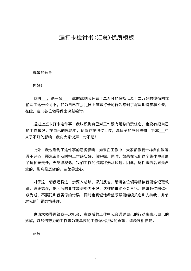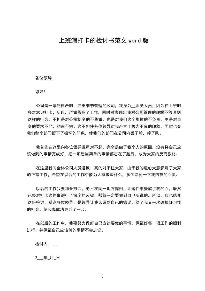 公司是一家纪律严明,注重细节管理的公司,我身为__职务人员,因为在上班时多次忘记打卡,所以,严重影响了工作,同时对表现出我对公司管理的理解不够深刻。这样的行为,不但是对公司制度的不尊重,也是对我们这个集体的不负责,更是对自身的要求不严,约束不够。这不但使各位领导对我产生了极为不良的印象,同时也令我们整个部门留下了极坏的印象,使我们的部门在公司内丢了脸,掉了队。
