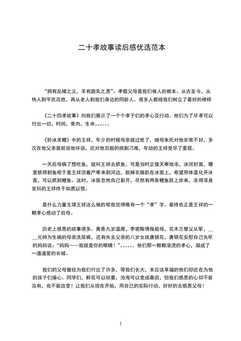 其实,今天,对我们来说,孝敬父母,回报父母,不必像上面所说的那样,要做一番惊天动地的事情。我们只要在平时多注意从身边小事做起,从一点一滴做起,就完全可以尽到我们对父母的孝敬之心。
