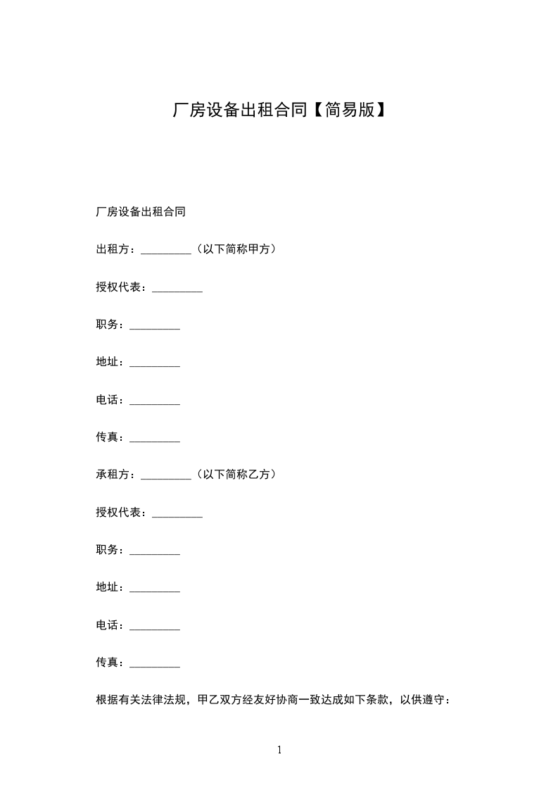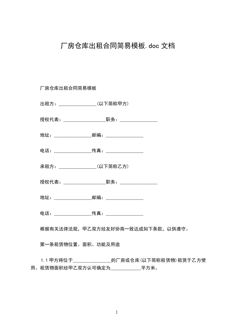 简易厂房出租合同模板