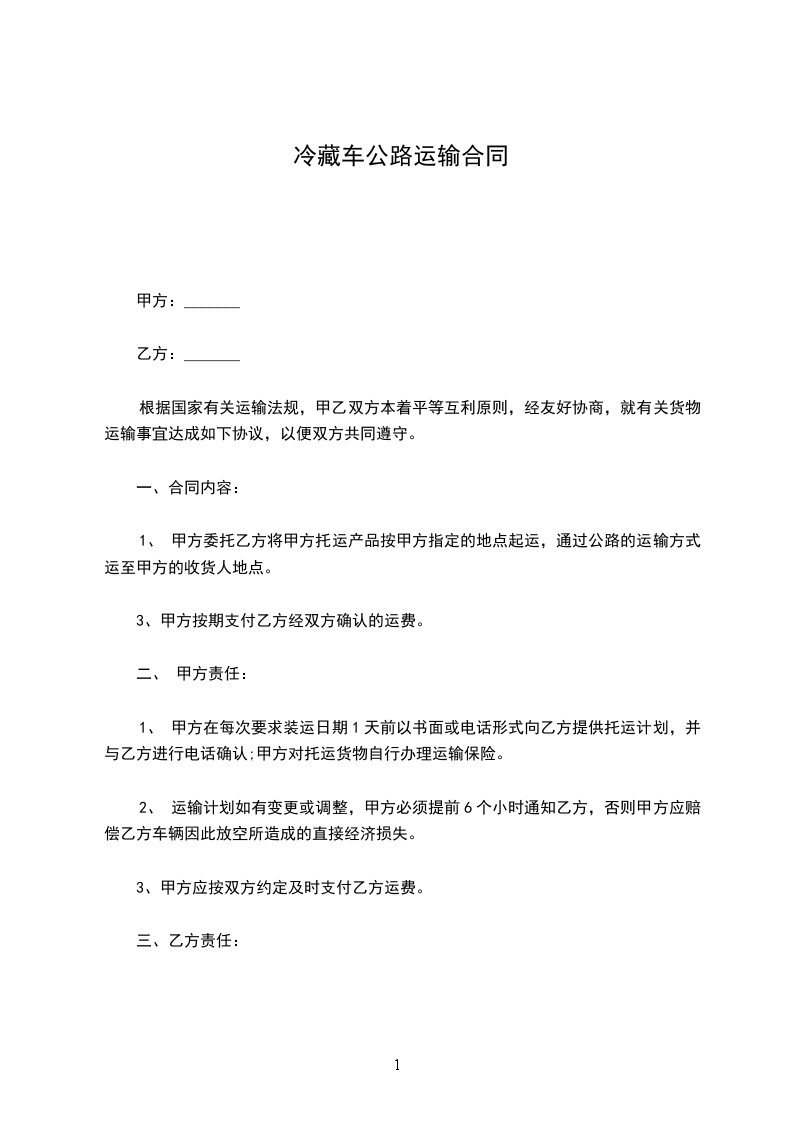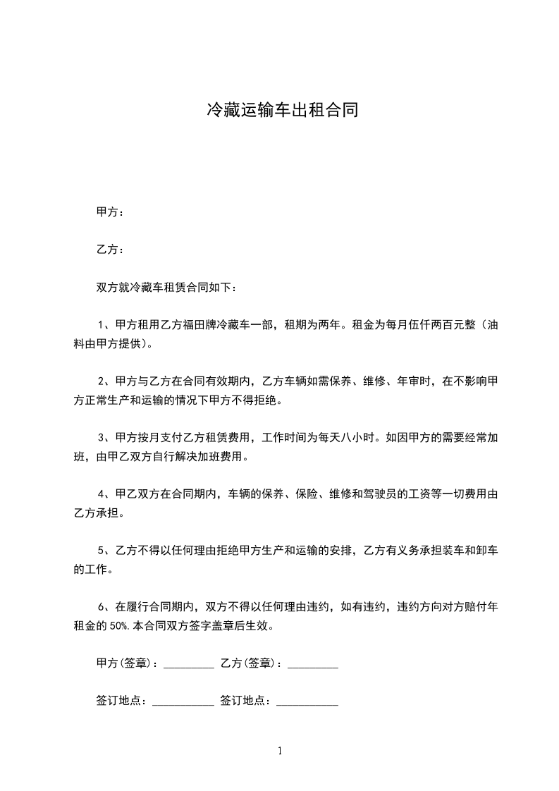 1、甲方租用乙方福田牌冷藏车一部,租期为两年。租金为每月伍仟两百元整(油料由甲方提供)。