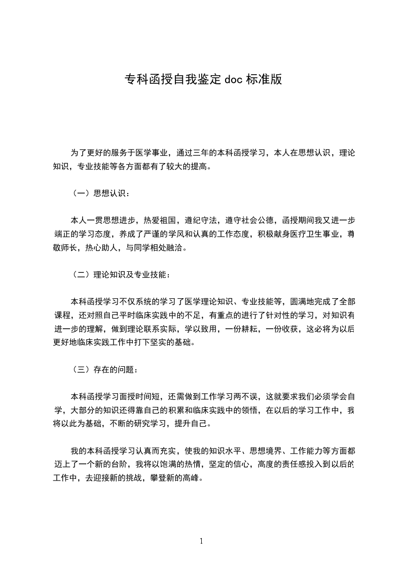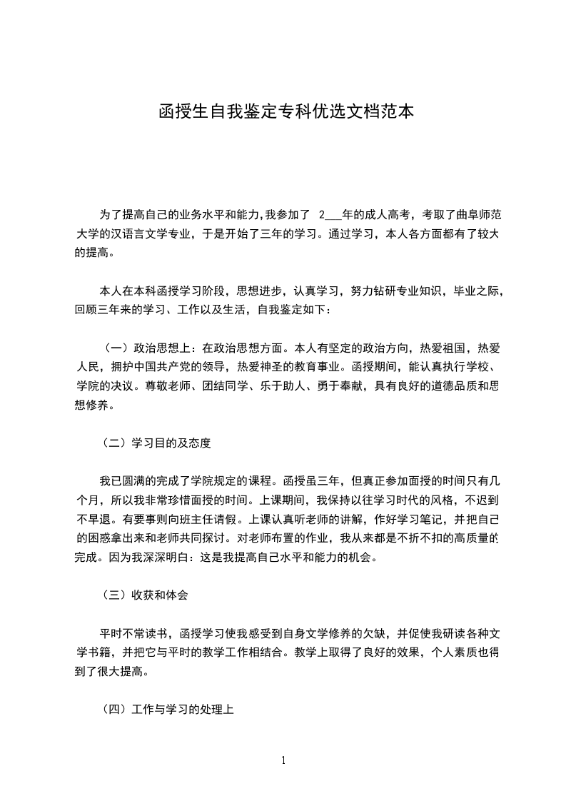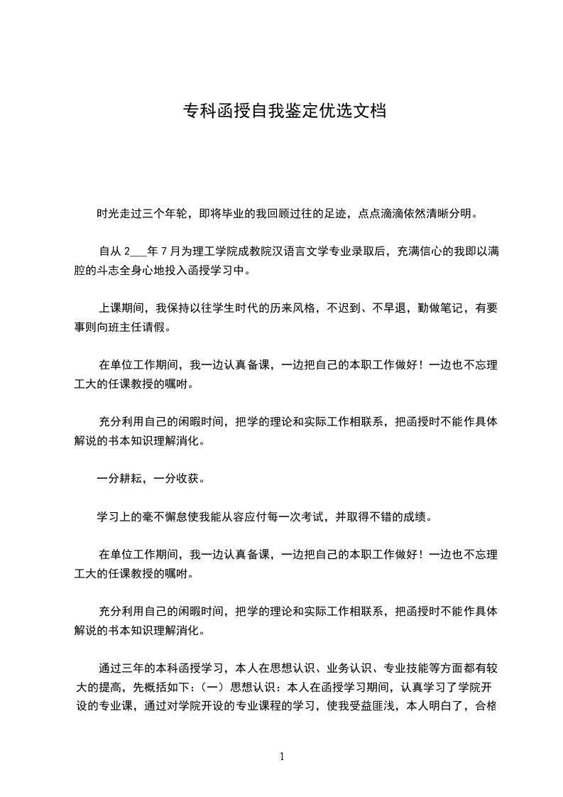 落笔的这一刻,心中强烈的感叹时光的匆匆,我的大学就这样要结束了,而我的感情还深深扎在校园里,我喜欢的校园生活即将要结束了,心中不是滋味。接到通知书那刻我是失落的,因为没有考到家人期望的本科,面对家人和朋友同情的眼光和语言我步入了我的大学,是的,我选择了坦然面对,我选择了这个学校。在短而珍贵的三年的时间里,我珍惜我努力,期待更多的挑战和机遇,让自己登上更高的台阶以看到更多的壮丽风光,尽管其中有过失败、迷茫、悲伤还有快乐!在此对自我做个鉴定如下: