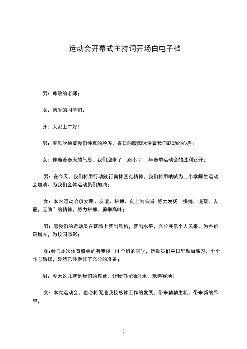 女:伴随着春天的气息,我们迎来了__路小2___年春季运动会的胜利召开;
