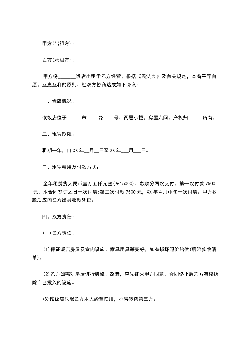 甲方将_______饭店出租于乙方经营,根据《民法典》及有关规定,本着平等自愿、互惠互利的原则,经双方协商达成如下协议: