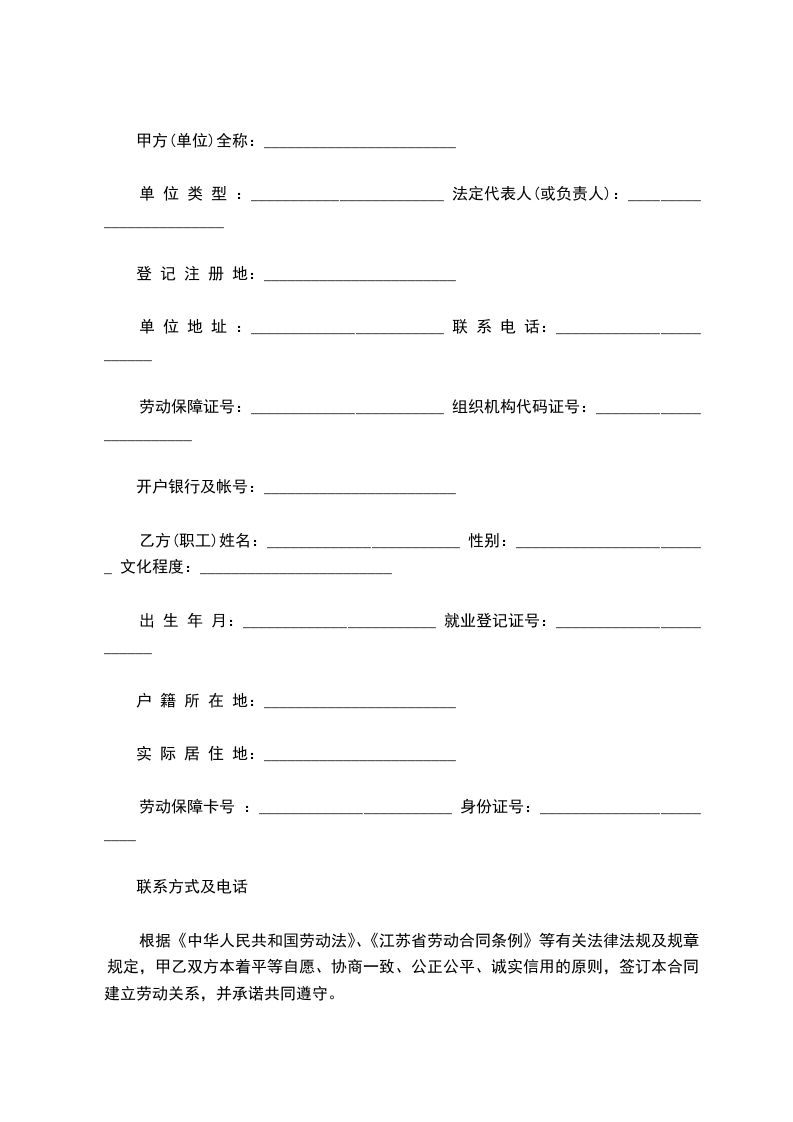 根据《中华人民共和国劳动法》、《江苏省劳动合同条例》等有关法律法规及规章规定,甲乙双方本着平等自愿、协商一致、公正公平、诚实信用的原则,签订本合同,建立劳动关系,并承诺共同遵守。