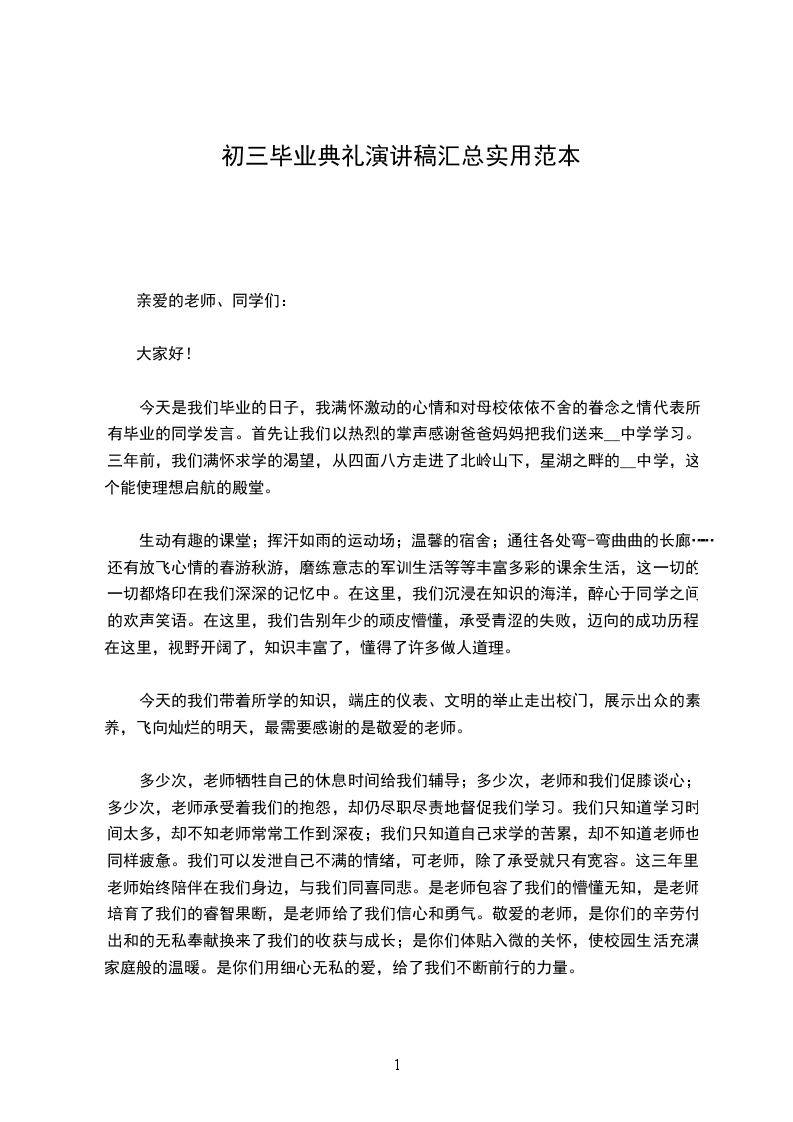 今天是我们毕业的日子,我满怀激动的心情和对母校依依不舍的眷念之情代表所有毕业的同学发言。首先让我们以热烈的掌声感谢爸爸妈妈把我们送来__中学学习。三年前,我们满怀求学的渴望,从四面八方走进了北岭山下,星湖之畔的__中学,这个能使理想启航的殿堂。