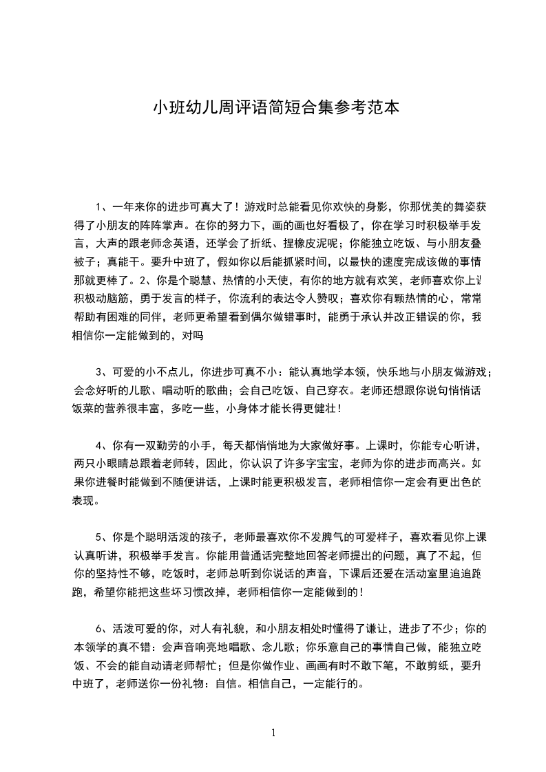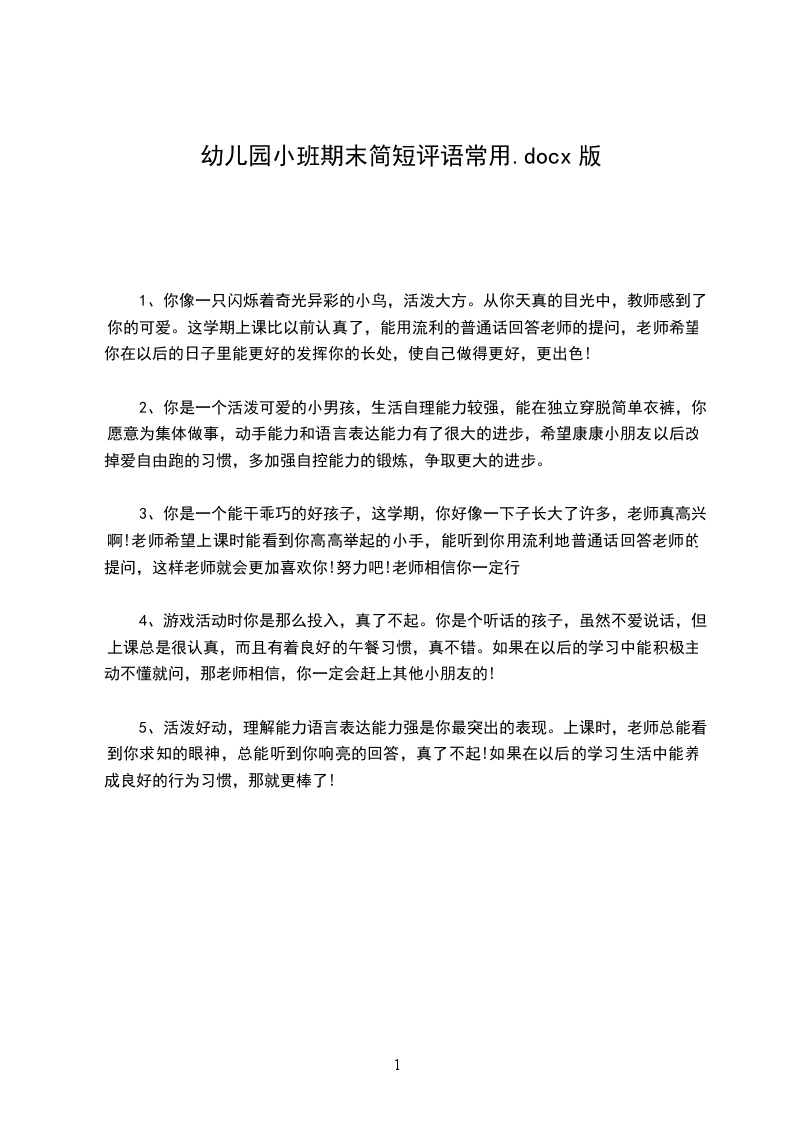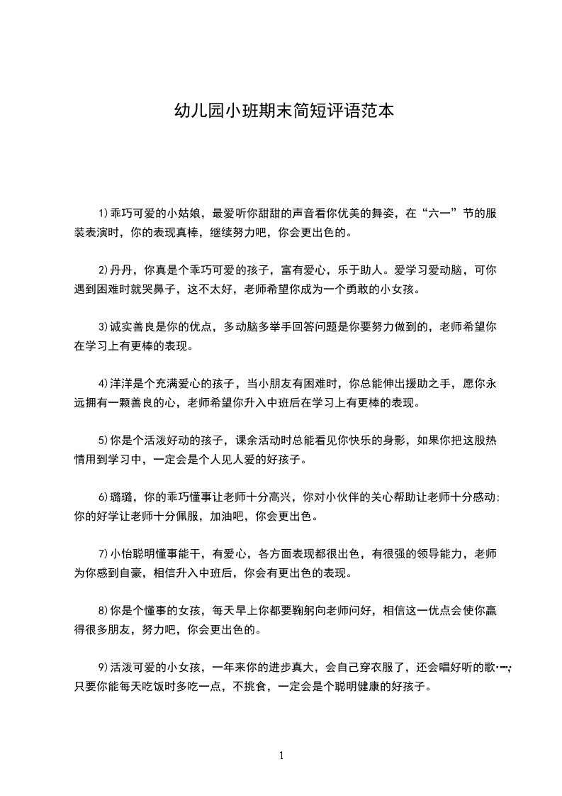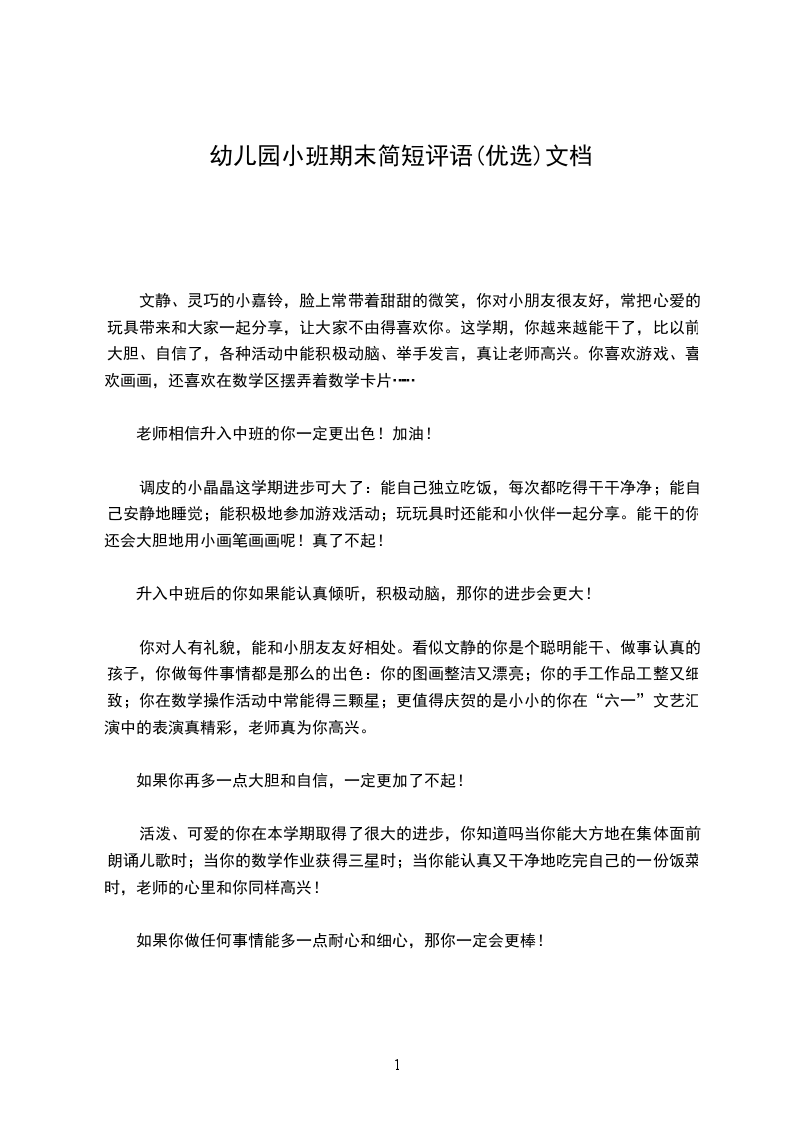 你是个聪明、有礼貌、喜欢帮老师做事的好孩子。你的动手能力很强,画画、手工都很好。你的拼音、数学练习做得不错。在庆六一演出中,你表演的节目真棒!老师和小朋友都为你鼓掌。希望你在以后的学习中再接再历,争取更大的成绩。
