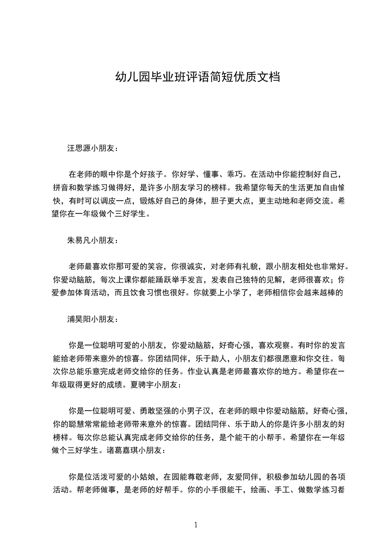 老师最喜欢你那可爱的笑容,你很诚实,对老师有礼貌,跟小朋友相处也非常好,你爱参加体育活动,而且饮食习惯也比以前好多了,健康的身体让你在体育课上惹人注目。希望你在一年级的各项活动中都能积极主动,成为全面发展的好孩子。