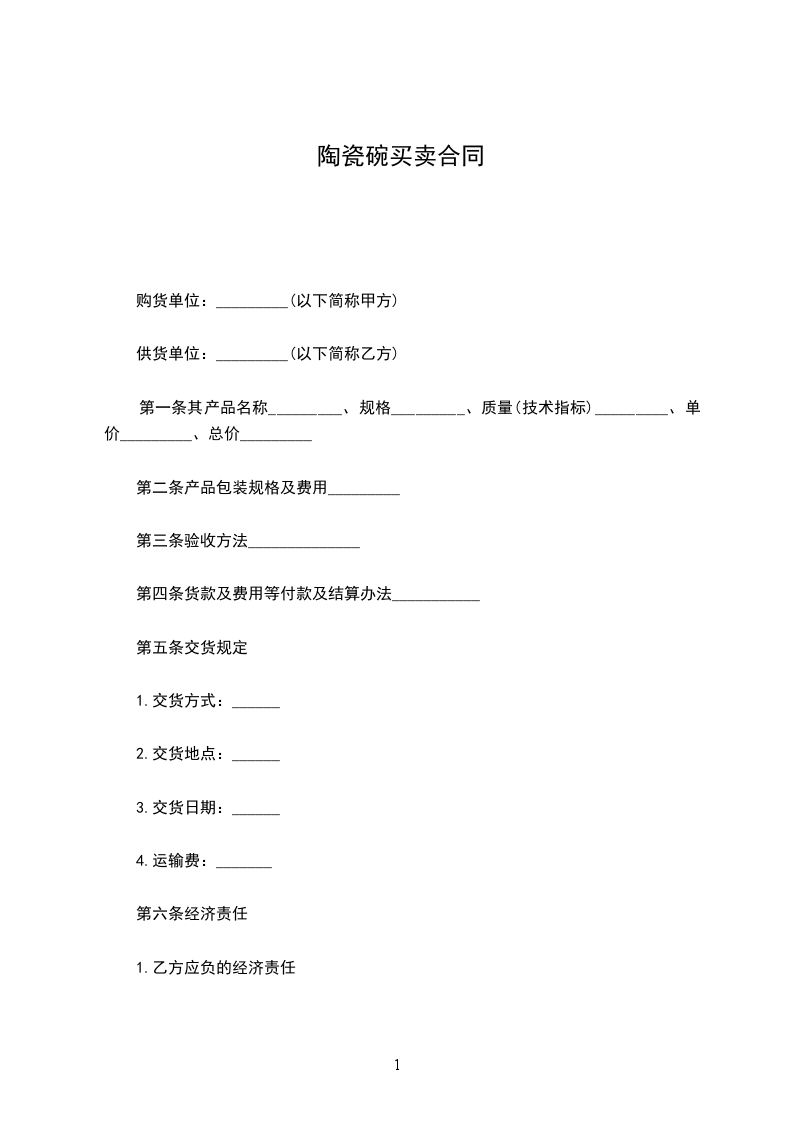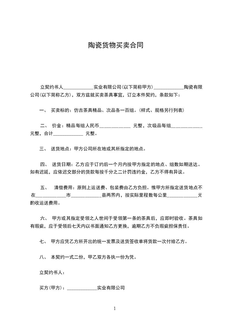 立契约书人_____________实业有限公司(以下简称甲方)_____________陶瓷有限公司(以下简称乙方),双方兹就买卖茶具事宜,订立本件契约,条款如下: