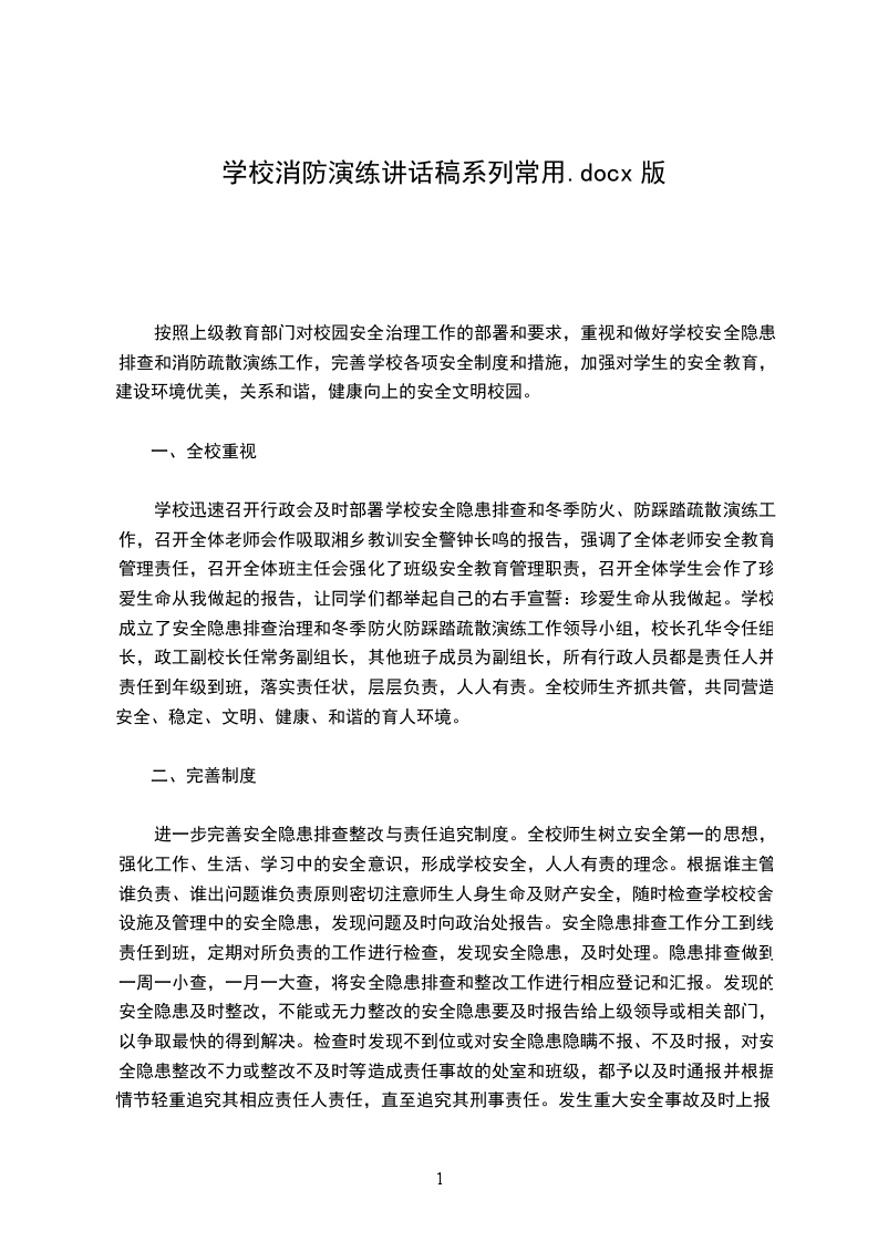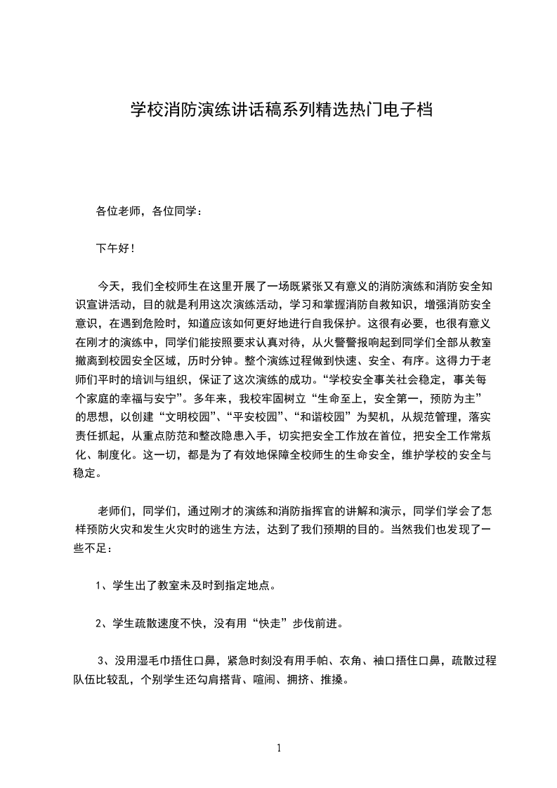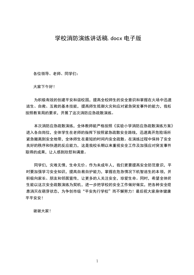今天,我们全校师生在这里开展了一场既紧张又有意义的消防演练和消防安全知识宣讲活动,目的就是利用这次演练活动,学习和掌握消防自救知识,增强消防安全意识,在遇到危险时,知道应该如何更好地进行自我保护。这很有必要,也很有意义。在刚才的演练中,同学们能按照要求认真对待,从火警警报响起到同学们全部从教室撤离到校园安全区域,历时分钟。整个演练过程做到快速、安全、有序。这得力于老师们平时的培训与组织,保证了这次演练的成功。“学校安全事关社会稳定,事关每个家庭的幸福与安宁”。多年来,我校牢固树立“生命至上,安全第一,预防为主”的思想,以创建“文明校园”、“平安校园”、“和谐校园”为契机,从规范管理,落实责任抓起,从重点防范和整改隐患入手,切实把安全工作放在首位,把安全工作常规化、制度化。这一切,都是为了有效地保障全校师生的生命安全,维护学校的安全与稳定。