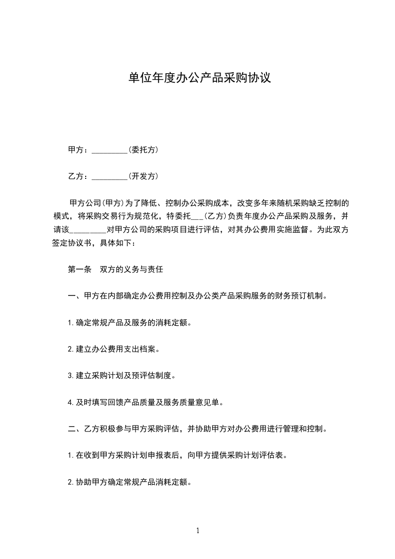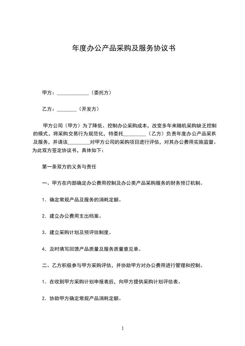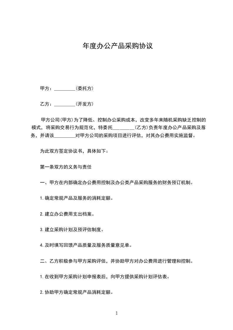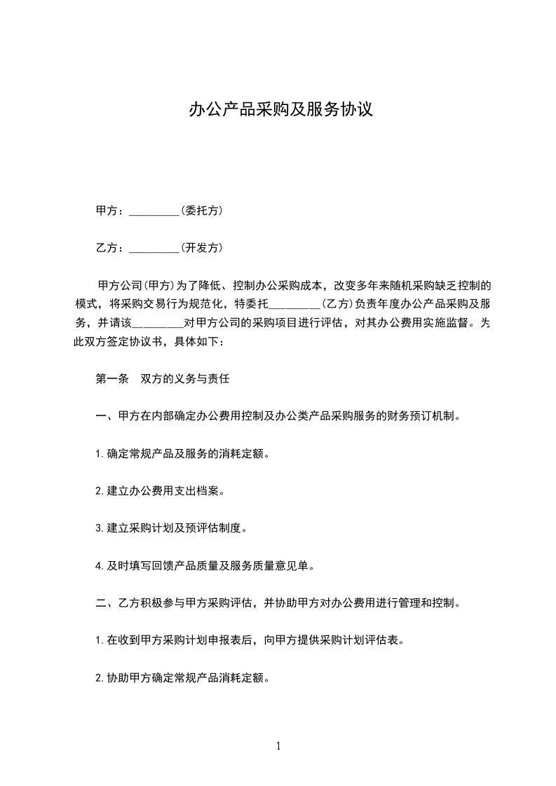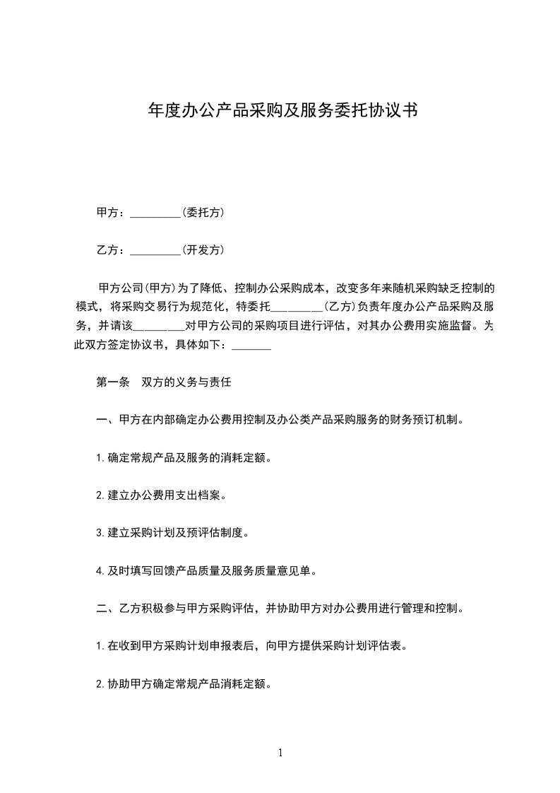 甲方公司(甲方)为了降低、控制办公采购成本,改变多年来随机采购缺乏控制的模式,将采购交易行为规范化,特委托_________(乙方)负责年度办公产品采购及服务,并请该_________对甲方公司的采购项目进行评估,对其办公费用实施监督。为此双方签定协议书,具体如下: