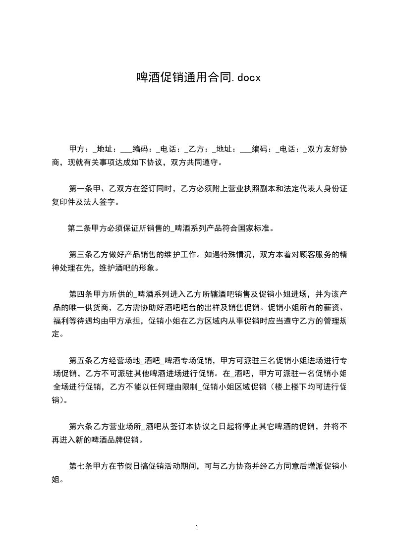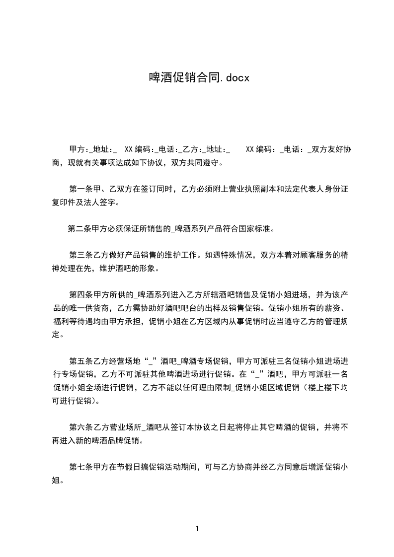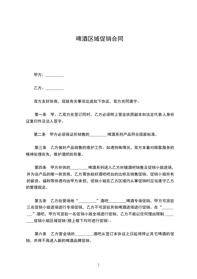 第五条 乙方经营场地“_________”酒吧_________啤酒专场促销,甲方可派驻三名促销小姐进场进行专场促销,乙方不可派驻其他啤酒进场进行促销。在“_________”酒吧,甲方可派驻一名促销小姐全场进行促销,乙方不能以任何理由限制_________促销小姐区域促销(楼上楼下均可进行促销)。