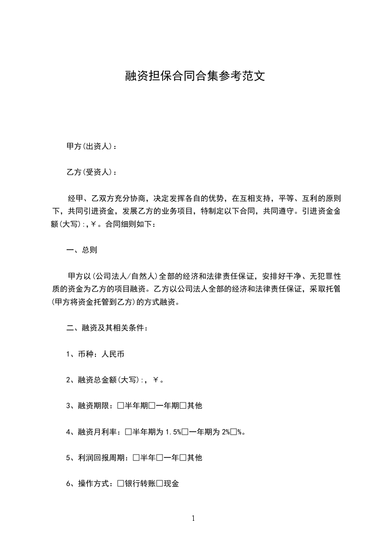 第一条甲方在融资金额为人民币,种类:。