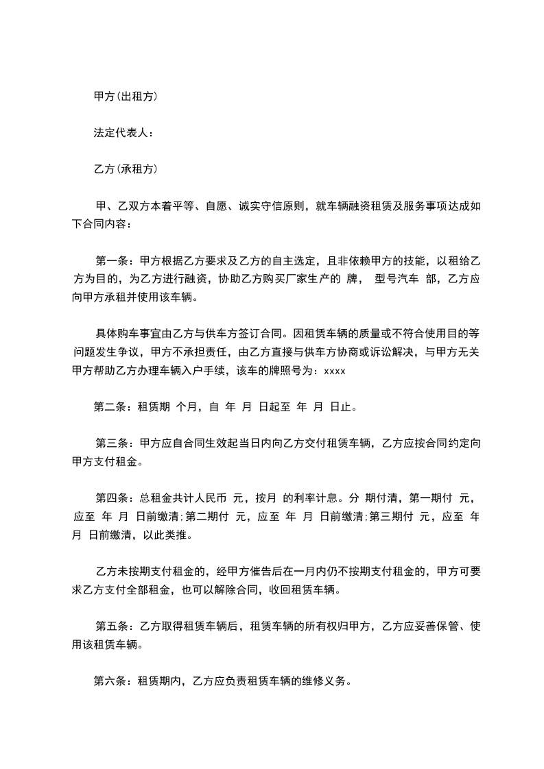 第一条:甲方根据乙方要求及乙方的自主选定,且非依赖甲方的技能,以租给乙方为目的,为乙方进行融资,协助乙方购买厂家生产的 牌, 型号汽车 部,乙方应向甲方承租并使用该车辆。