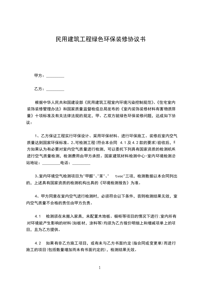 根据中华人民共和国建设部《民用建筑工程室内环境污染控制规范》、《住宅室内装饰装修管理办法》和国家质量监督检疫总局发布的《室内装饰装修材料有害物质限量》十项标准及有关法律法规的规定,甲、乙双方就绿色环保装修问题,达成如下协议: