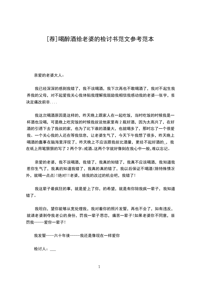 喝醉当天,我可爱美丽温柔善良的老婆就在我的旁边,并且一直都在为我担心,一直默默地关怀着我,我都没有察觉到。我无视您的嘱托和交代,在老婆就在身边的情况下酗酒,严重违反了家庭纪律,对老婆和我们的爱情都造成了不良影响,让我的老婆时时为我担惊受怕。我感觉到很内疚。我有个毛病,就是一和同事、朋友们在一起的时候,就容易融入气氛,所以可能就忽视了身边的老婆,其实也不是有意这样做的,都是无意识的情况下才发生的这些,所以请老婆要见谅!可能老婆不知道,当我早晨醒来一睁眼就感觉快能见到宝贝的时候,那一刻,我感觉我特别幸福,说不出来的幸福,一种从未有过的幸福,我也真真的感受到了幸福!但是就在前一天晚上,我确喝多了,在很多人面前丢人了,让我的宝贝伤心,为我担心了!