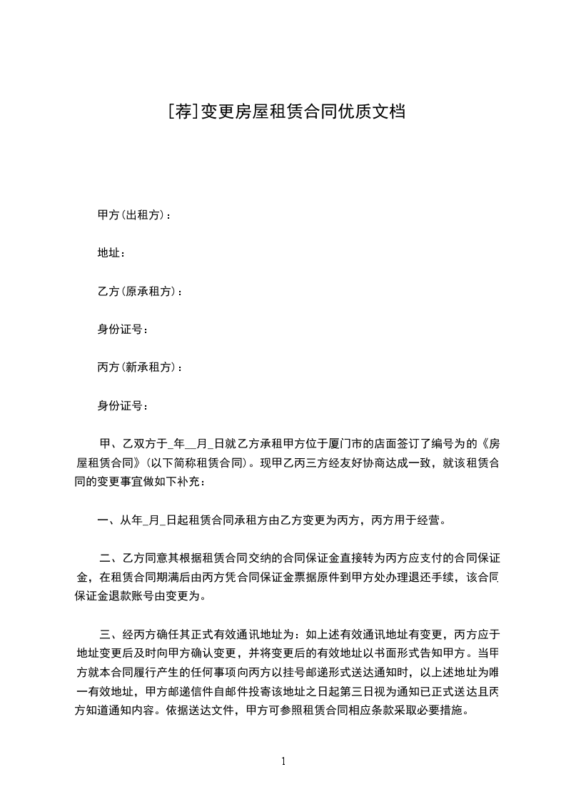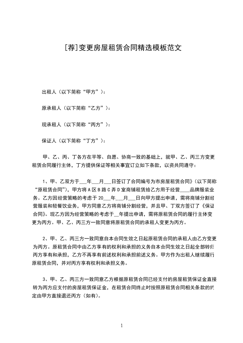 鉴于:甲乙双方于_年__月_日签署《房屋租赁合同》(简称原合同),约定乙方租赁甲方位于物业。现由于原因需将原合同承租方变更为丙方,经三方协商一致签订本协议。