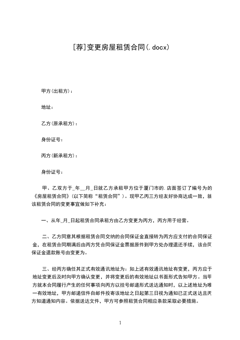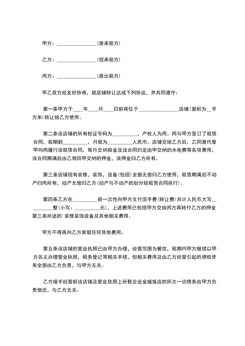 一、原合同中的承租方由乙方变更为丙方,乙方作为承租方的权利义务自年_月_日开始由丙方承担,丙方按照原合同的约定缴纳租金、物业管理费、能耗费及其他费用。原合同中约定的乙方已交纳的保证金(押金),甲方待租赁期满或租赁关系解除后按照原合同约定退还给丙方,乙丙双方另行结算。如乙方原缴纳租金、物业管理费和能耗费等其他费用超过实际租赁期,则超过部分转为丙方预付的相应费用,乙丙双方另行结算。