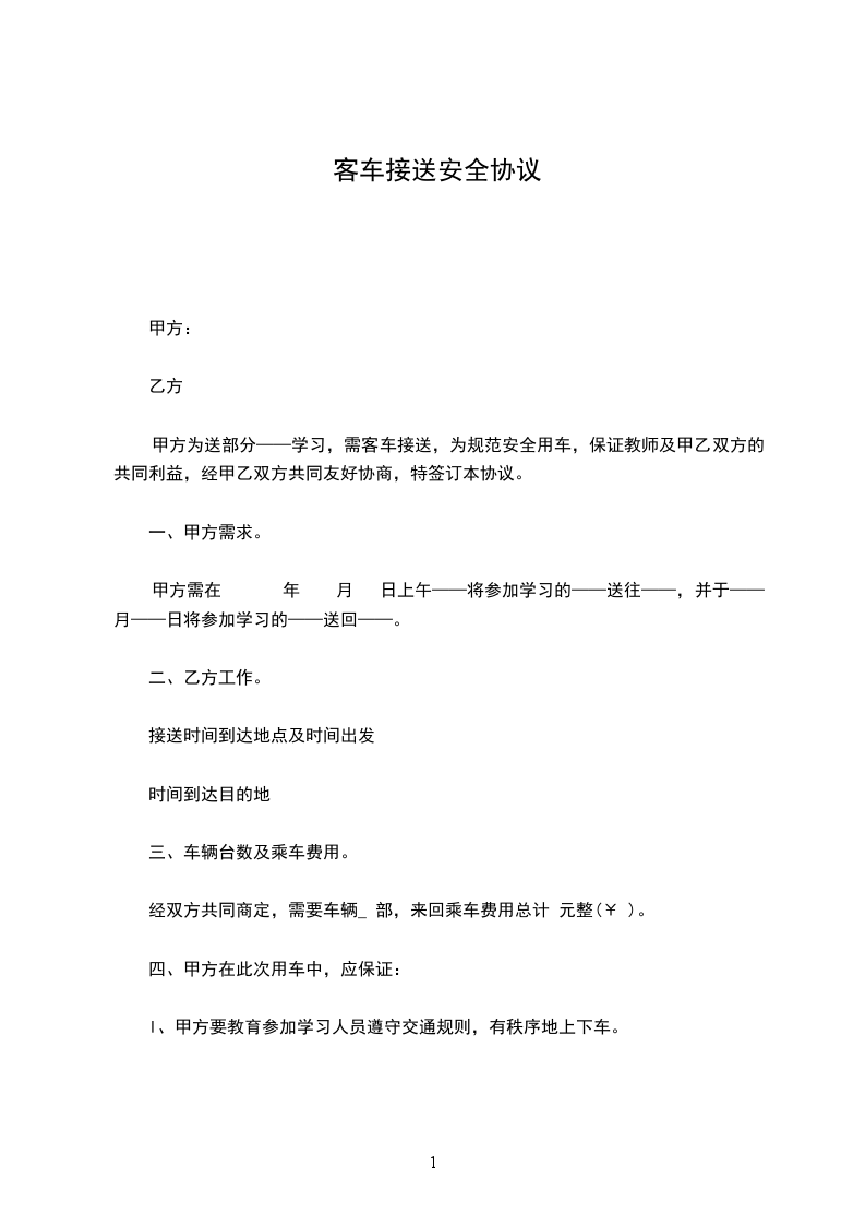 甲方为送部分——学习,需客车接送,为规范安全用车,保证教师及甲乙双方的共同利益,经甲乙双方共同友好协商,特签订本协议。