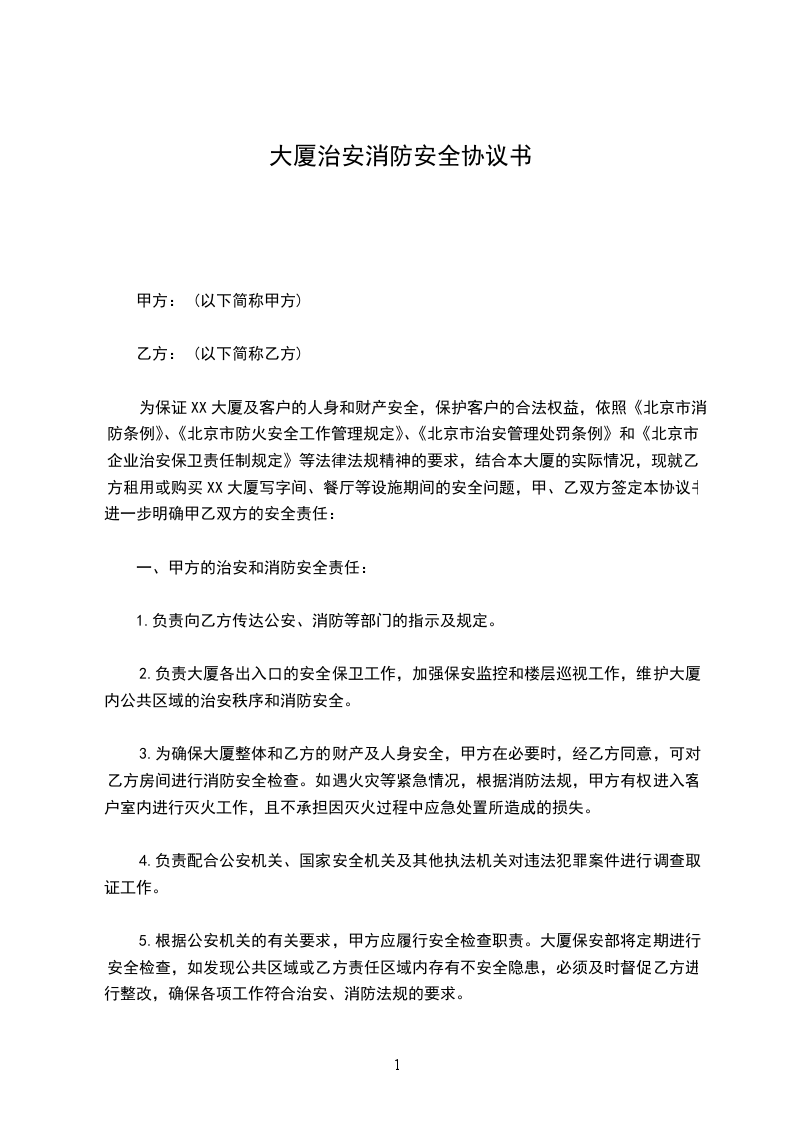 为保证XX大厦及客户的人身和财产安全,保护客户的合法权益,依照《北京市消防条例》、《北京市防火安全工作管理规定》、《北京市治安管理处罚条例》和《北京市企业治安保卫责任制规定》等法律法规精神的要求,结合本大厦的实际情况,现就乙方租用或购买XX大厦写字间、餐厅等设施期间的安全问题,甲、乙双方签定本协议书,进一步明确甲乙双方的安全责任: