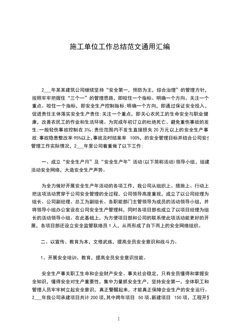 2___年某某建筑公司继续坚持“安全第一,预防为主,综合治理”的管理方针,按照牢牢把握住“三个一”的管理思路,即咬住一个指标、明确一个方向、关注一个重点。咬住一个指标,即安全生产控制指标;明确一个方向,即通过保证安全投入,促进责任主体落实安全生产责任;关注一个重点,即关心农民工的生命安全与职业健康,改善农民工的作业和生活环境。为完成年初订立的杜绝死亡、避免重伤事故的发生;一般轻伤事故控制在3‰;责任范围内不发生直接损失20万元以上的安全生产事故;事故隐患整改率95%以上,事故及时结案率100%,的安全管理目标并结合公司安全管理工作实际情况,2___年里公司着重做了以下工作: