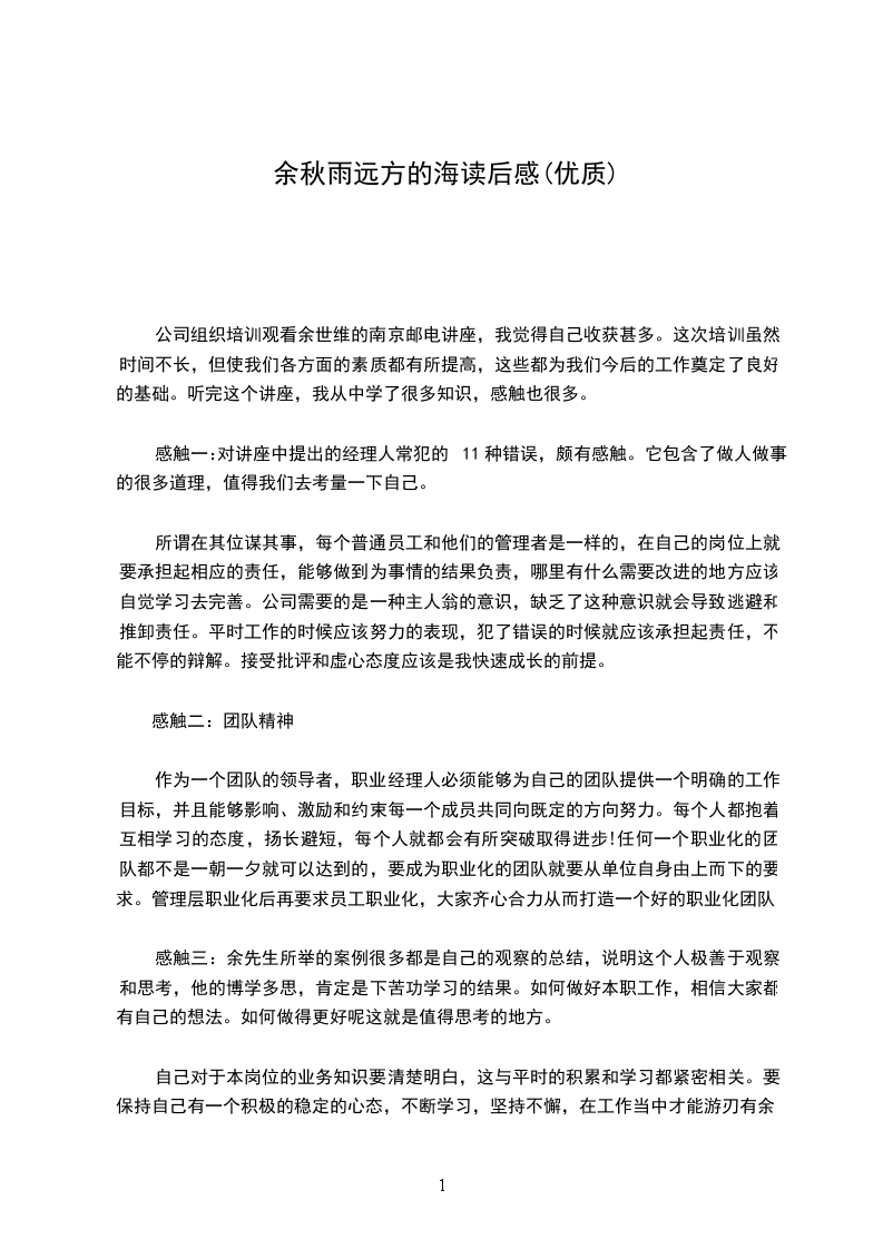 公司组织培训观看余世维的南京邮电讲座,我觉得自己收获甚多。这次培训虽然时间不长,但使我们各方面的素质都有所提高,这些都为我们今后的工作奠定了良好的基础。听完这个讲座,我从中学了很多知识,感触也很多。