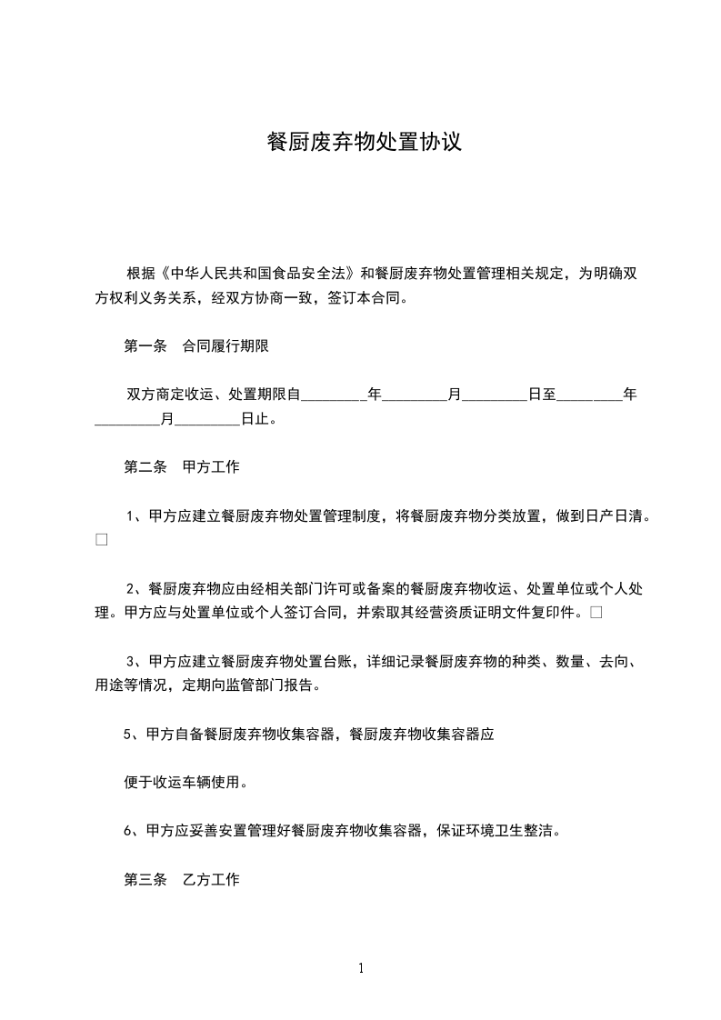1、甲方应建立餐厨废弃物处置管理制度,将餐厨废弃物分类放置,做到日产日清。