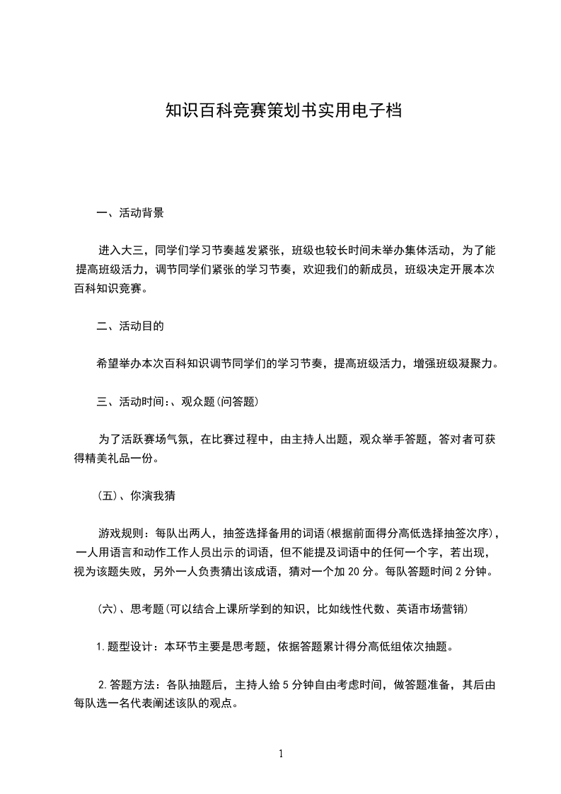 5)抢答夺冠:工作人员会放一段音乐或电视片段或题目。参赛者在主持人念完题目“开始”方可进行抢答,否则无效。选手回答完请说“回答完毕”。答对每道题加100分。答错或超过30秒未做答的倒扣100分。(本轮环节,每队可拥有一次机会求助现场观众,观众若答对照样给予相应的分数,但只有一次机会)