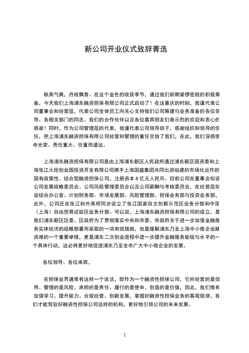 秋高气爽,丹桂飘香。在这个金色的收获季节,通过我们前期紧锣密鼓的积极筹备,今天我们上海浦东融资担保有限公司正式启动了!在这喜庆的时刻,我谨代表公司董事会和经营层,代表公司全体员工向关心支持我们公司筹建与业务准备的各位领导、各相关部门的同志、我们的合作伙伴以及各位嘉宾朋友们表示烈的欢迎和衷心的感谢!同时,作为公司管理层的代表,我谨代表公司领导班子,感谢组织和领导的信任,把上海浦东融资担保有限公司经营和管理的重任交给了我们,在此,我们深感使命光荣、责任重大、任重而道远。