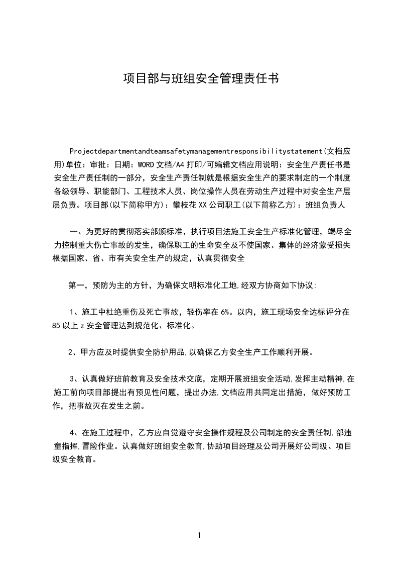 五、本责任书一式四份,甲乙双方各执二份。