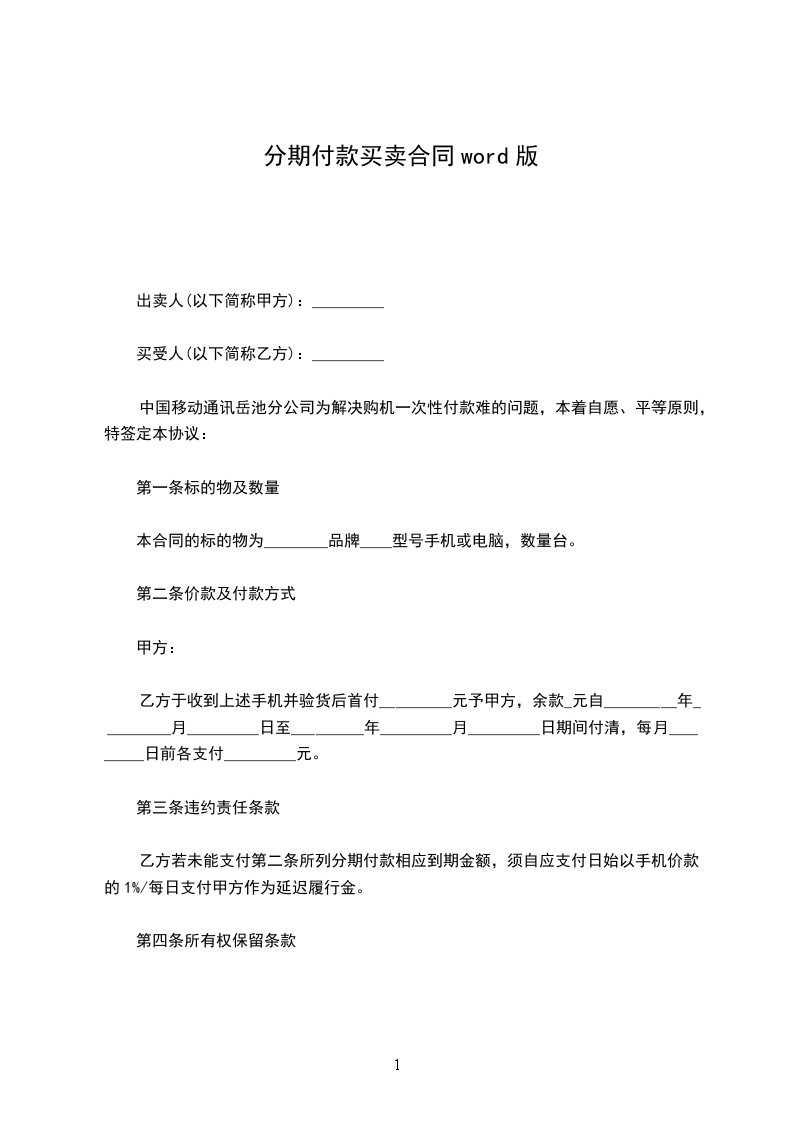 中国移动通讯岳池分公司为解决购机一次性付款难的问题,本着自愿、平等原则,特签定本协议: