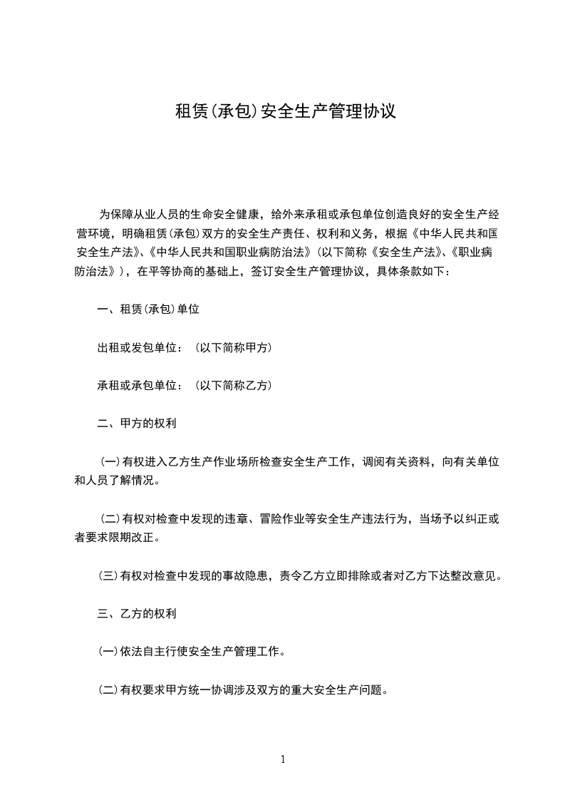 为保障从业人员的生命安全健康,给外来承租或承包单位创造良好的安全生产经营环境,明确租赁(承包)双方的安全生产责任、权利和义务,根据《中华人民共和国安全生产法》、《中华人民共和国职业病防治法》(以下简称《安全生产法》、《职业病防治法》),在平等协商的基础上,签订安全生产管理协议,具体条款如下: