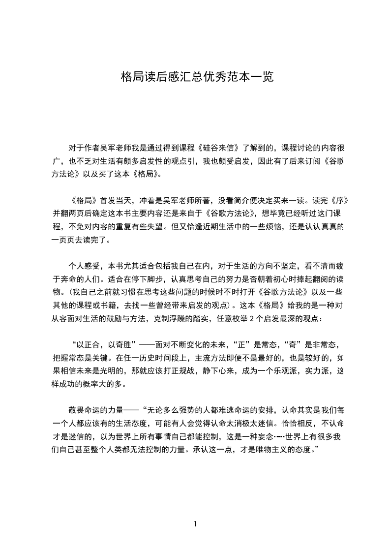 《格局》首发当天,冲着是吴军老师所著,没看简介便决定买来一读。读完《序》并翻两页后确定这本书主要内容还是来自于《谷歌方法论》,想毕竟已经听过这门课程,不免对内容的重复有些失望。但又恰逢近期生活中的一些烦恼,还是认认真真的一页页去读完了。